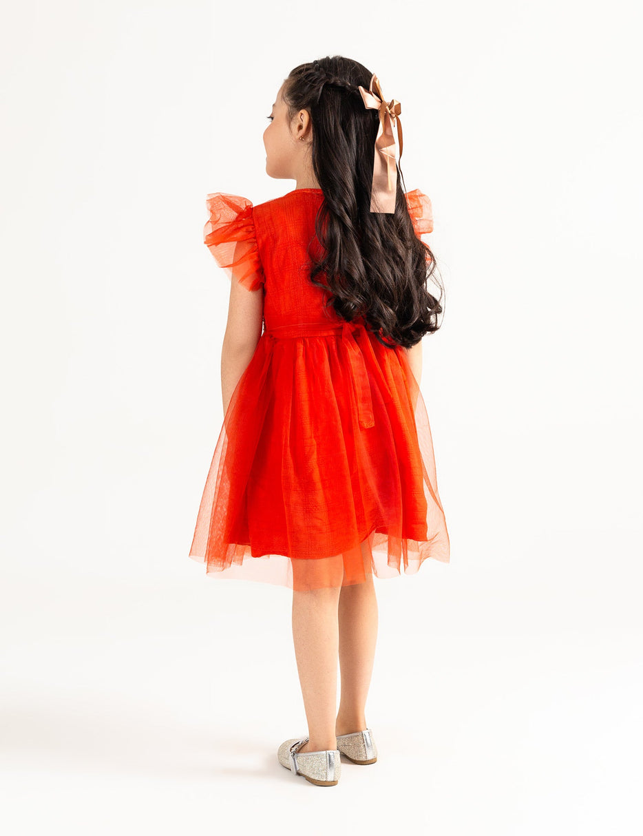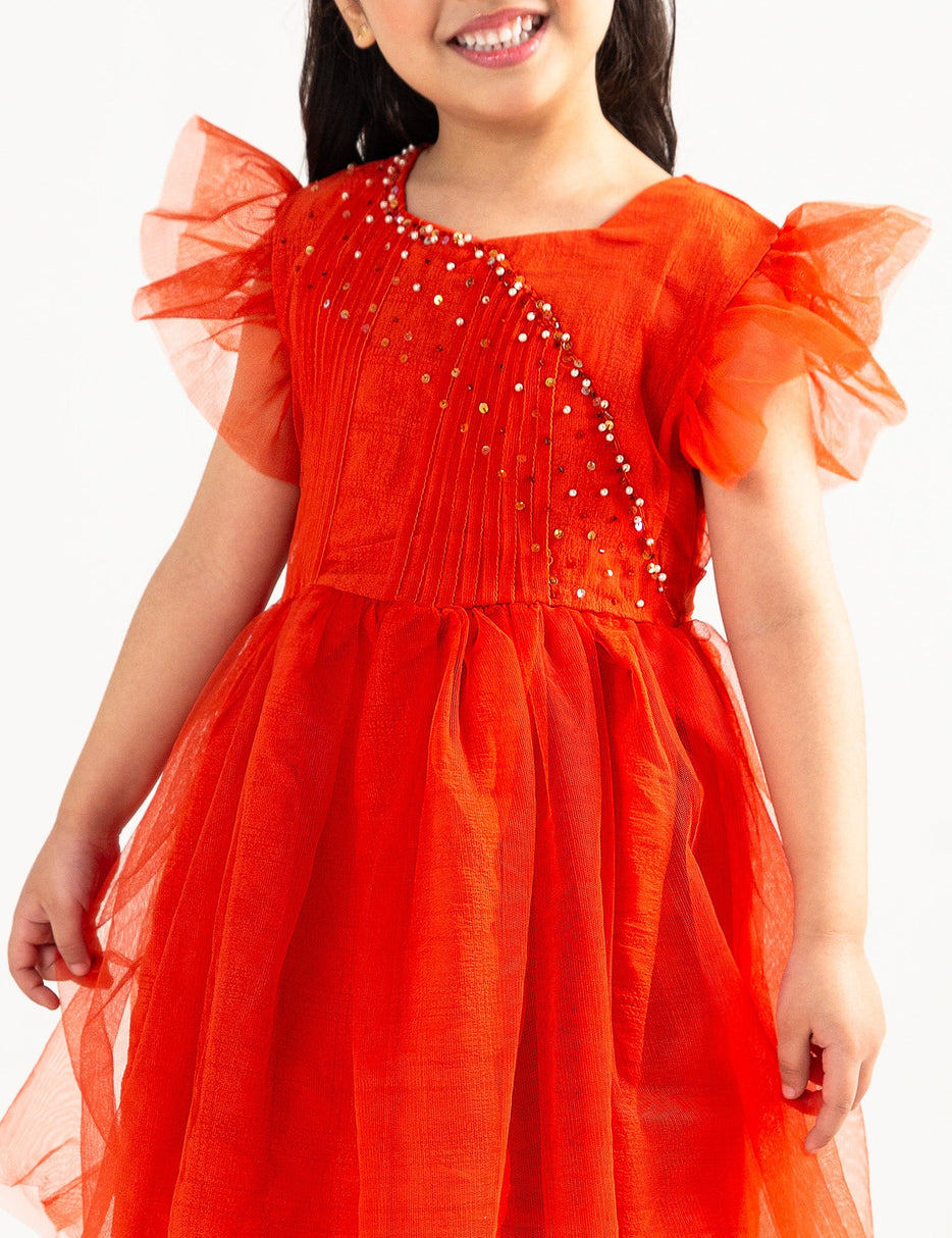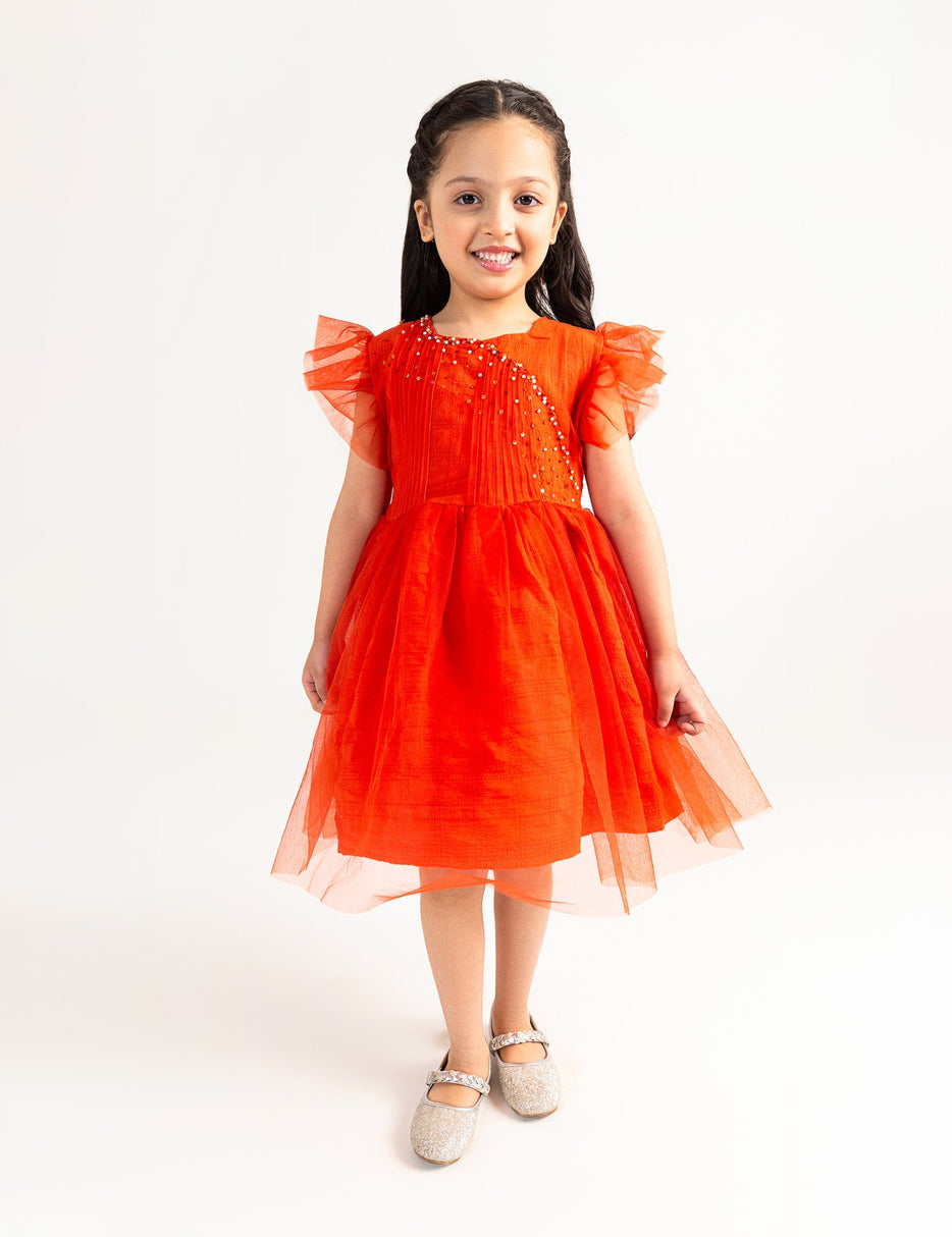 Enhance you girl's wardrobe with this pleated net frock with delicate embellishments and frilled sleeves, creating a charming and elegant look for special occasions.