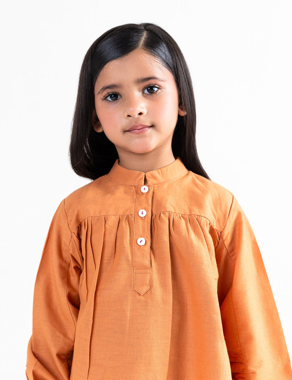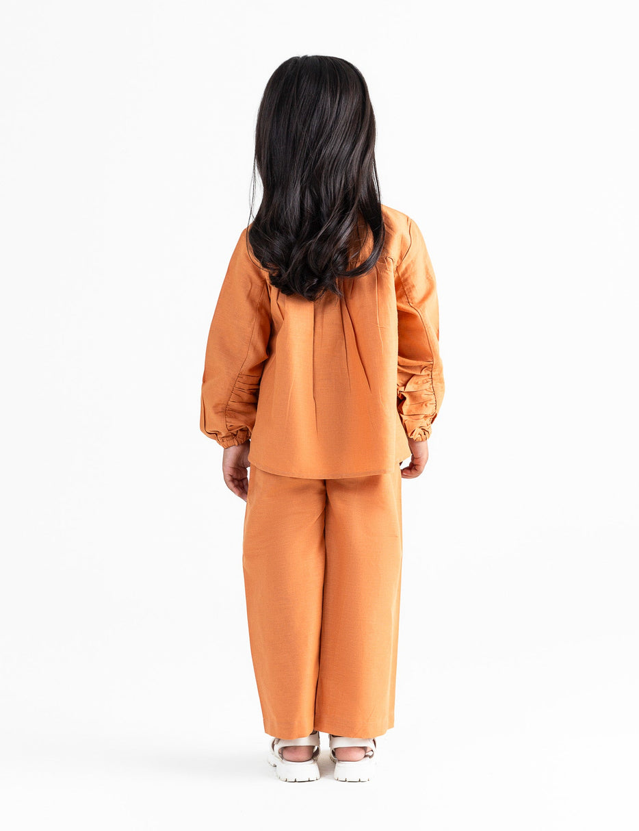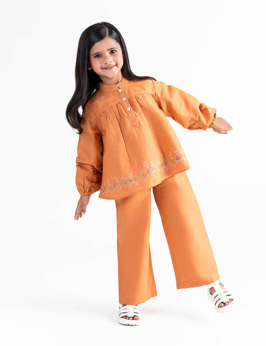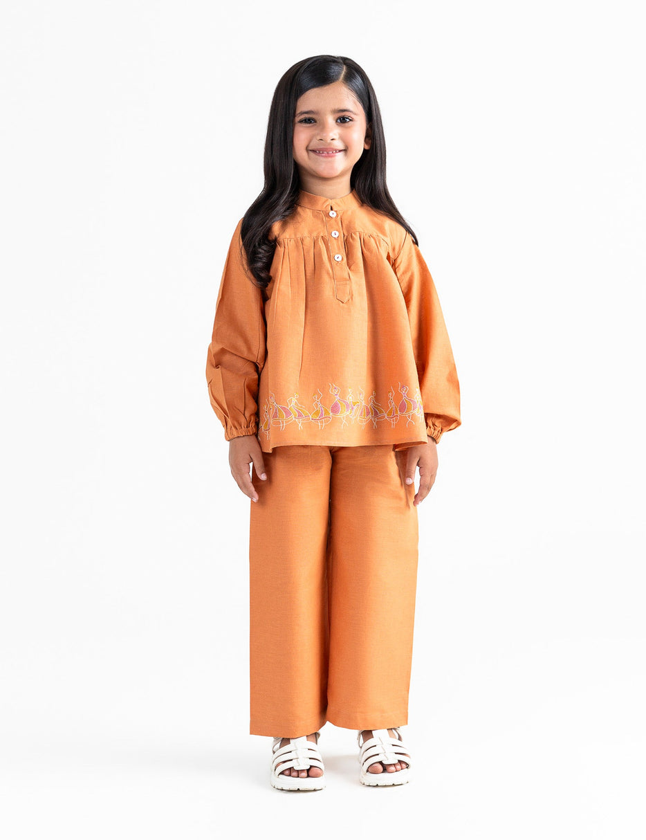 Add to your kid's wardrobe this flared top with band collar, yoke with gathers and an embroidered detail of dancing princesses at the hem. The voluminous sleeves with gathers details create an effortless and chic look, perfect for any summer event.