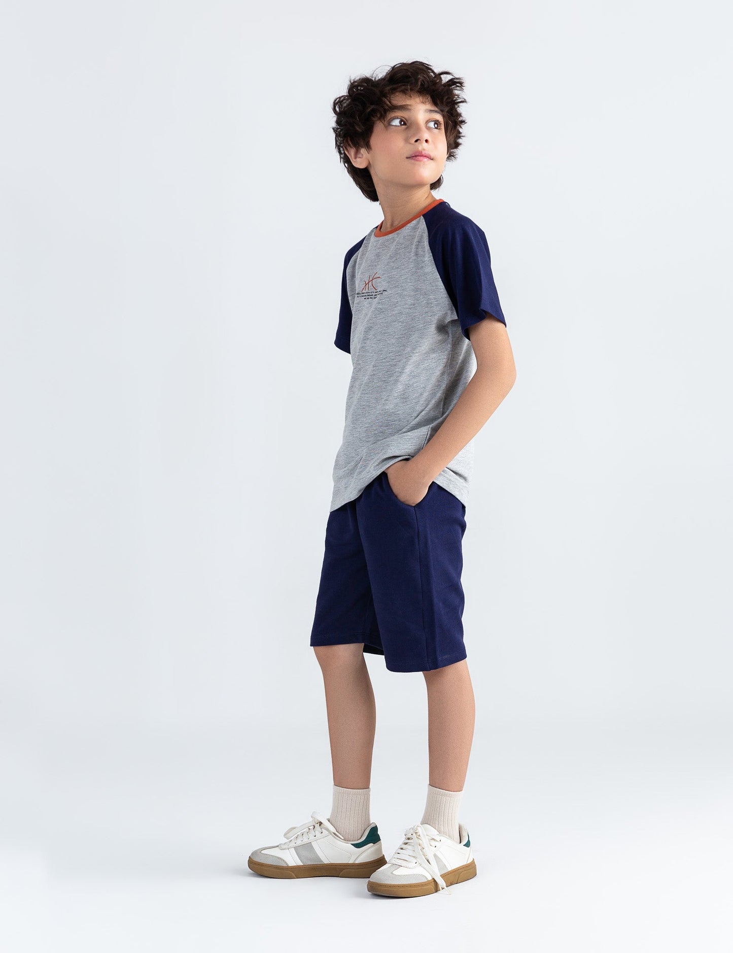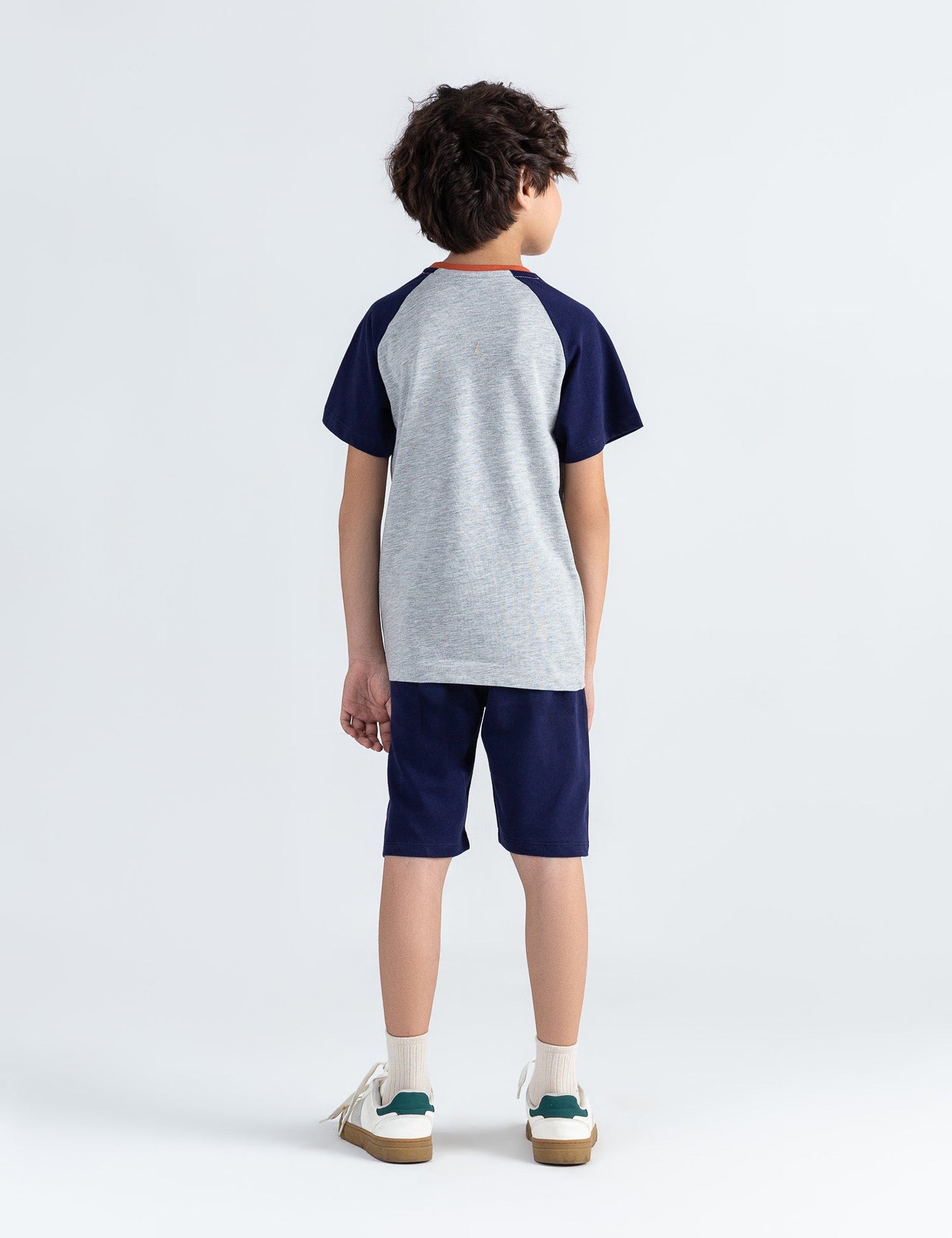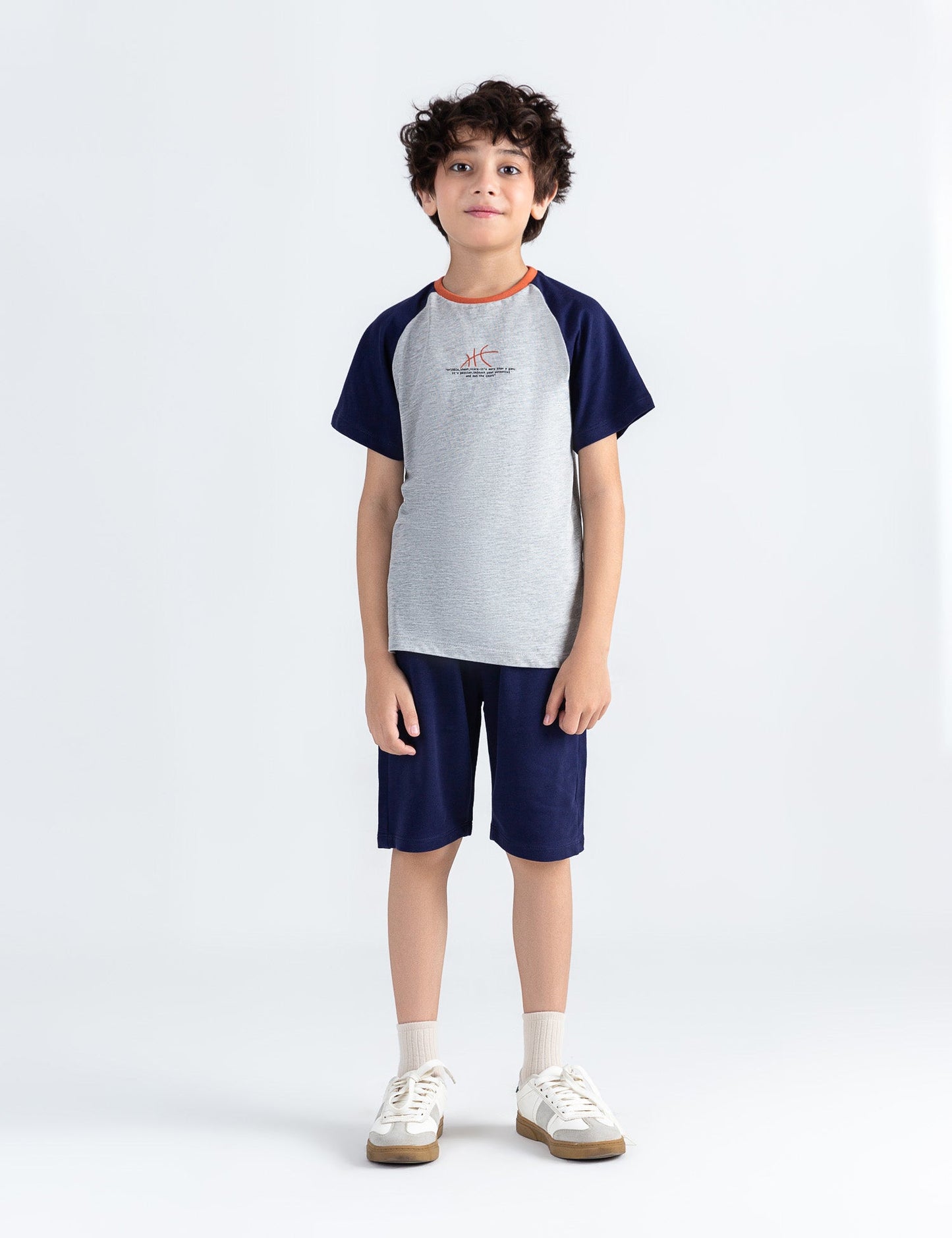 Keep him comfortable and sporty with this 2-piece activewear suit, perfect for playtime, sports, or casual outings! The set includes a short-sleeve color block t-shirt with navy sleeves and a light grey body, accented by an orange neckline and a subtle athletic graphic at the chest. Paired with matching navy shorts featuring an elastic waistband and drawstring for a secure, flexible fit. Made from soft, breathable fabric, this outfit is designed for all-day comfort and movement.