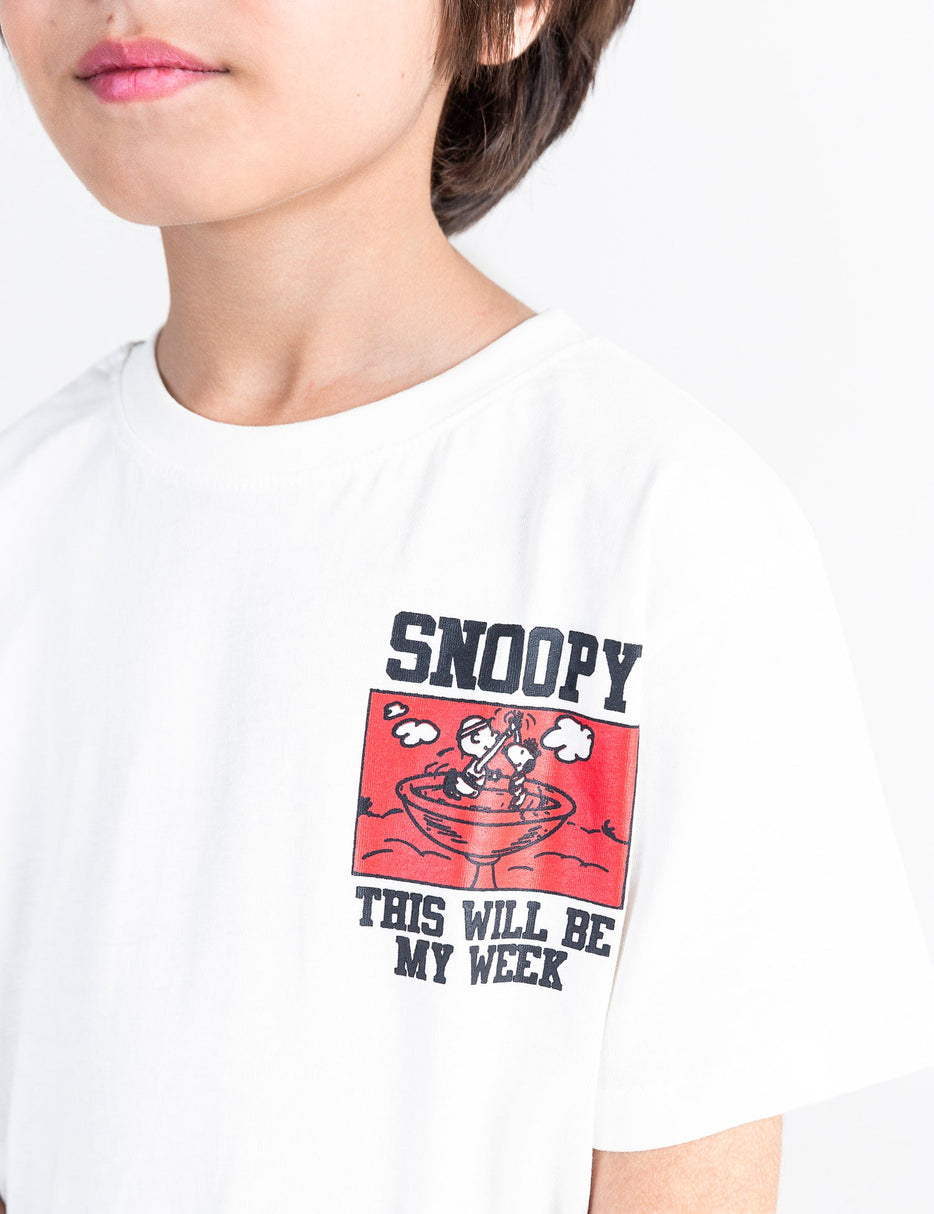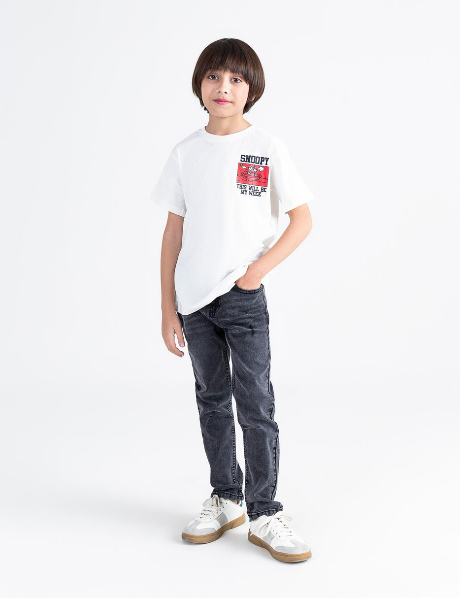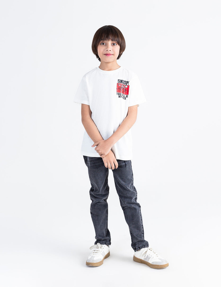 Elevate your boy's style with this T-shirt featuring a captivating Snoopy print. The crew neck and short sleeves provide comfort, while the jersey fabric ensures breathability. Let your active kid flaunt his favourite cartoon character with this trendy addition to his wardrobe.