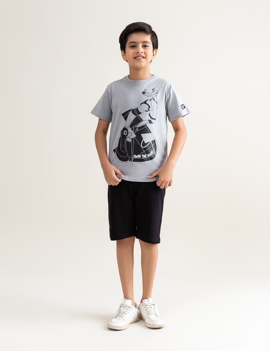 Let him channel his inner champion with this "Own The Court" basketball graphic t-shirt! Featuring a bold, dynamic print of a player mid-dunk, this grey tee brings sporty energy to his everyday wardrobe. Made from soft, breathable fabric, it’s perfect for active days on and off the court. With a classic crew neck and easy fit, it pairs effortlessly with joggers, shorts, or jeans for a cool and confident look. A slam dunk for any young baller!