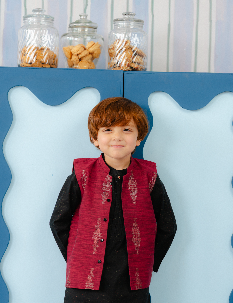 Classic waistcoat is designed in tilla embroidered detail. Paired with matching kurta and trouser set. Must have this for upcomig festive season.