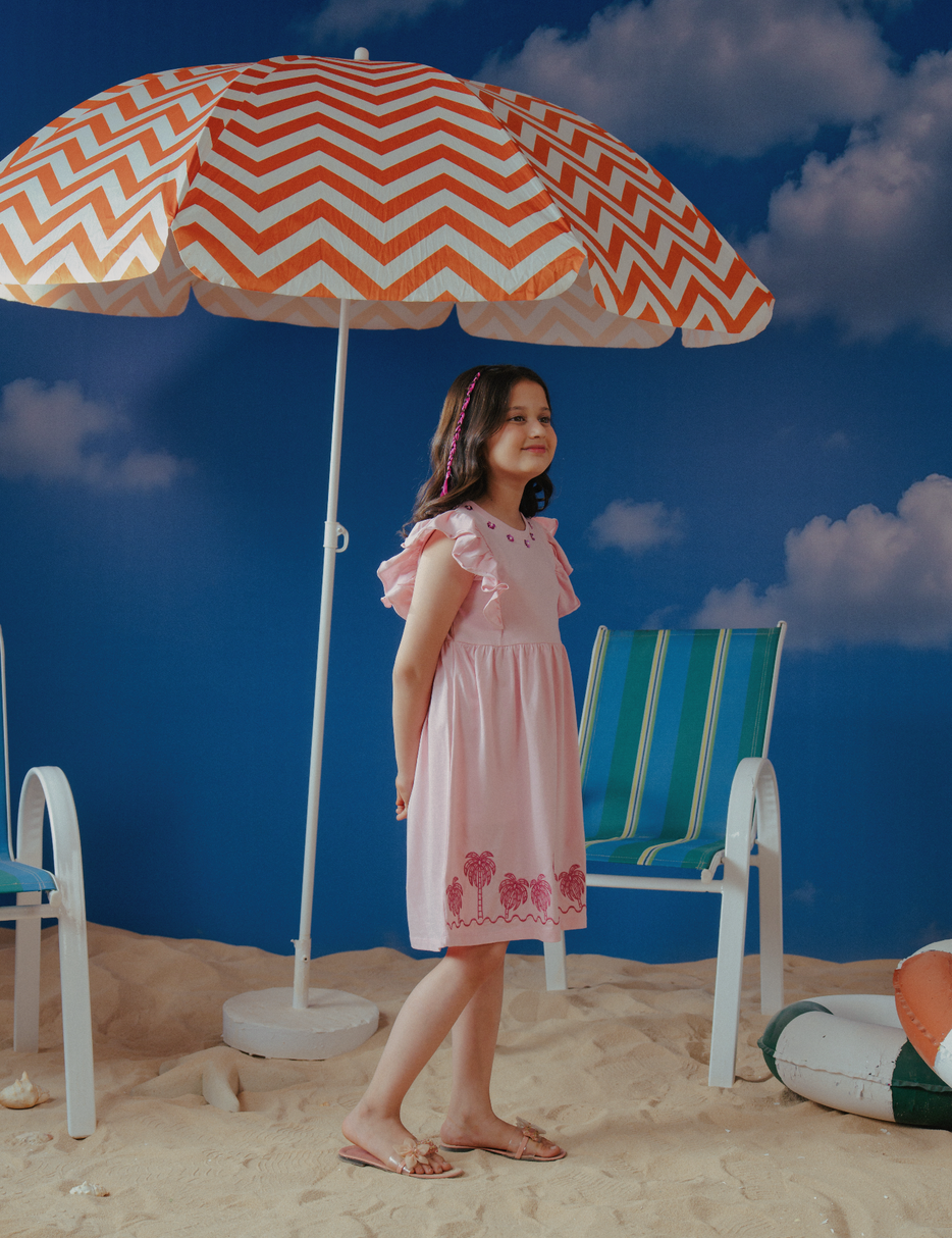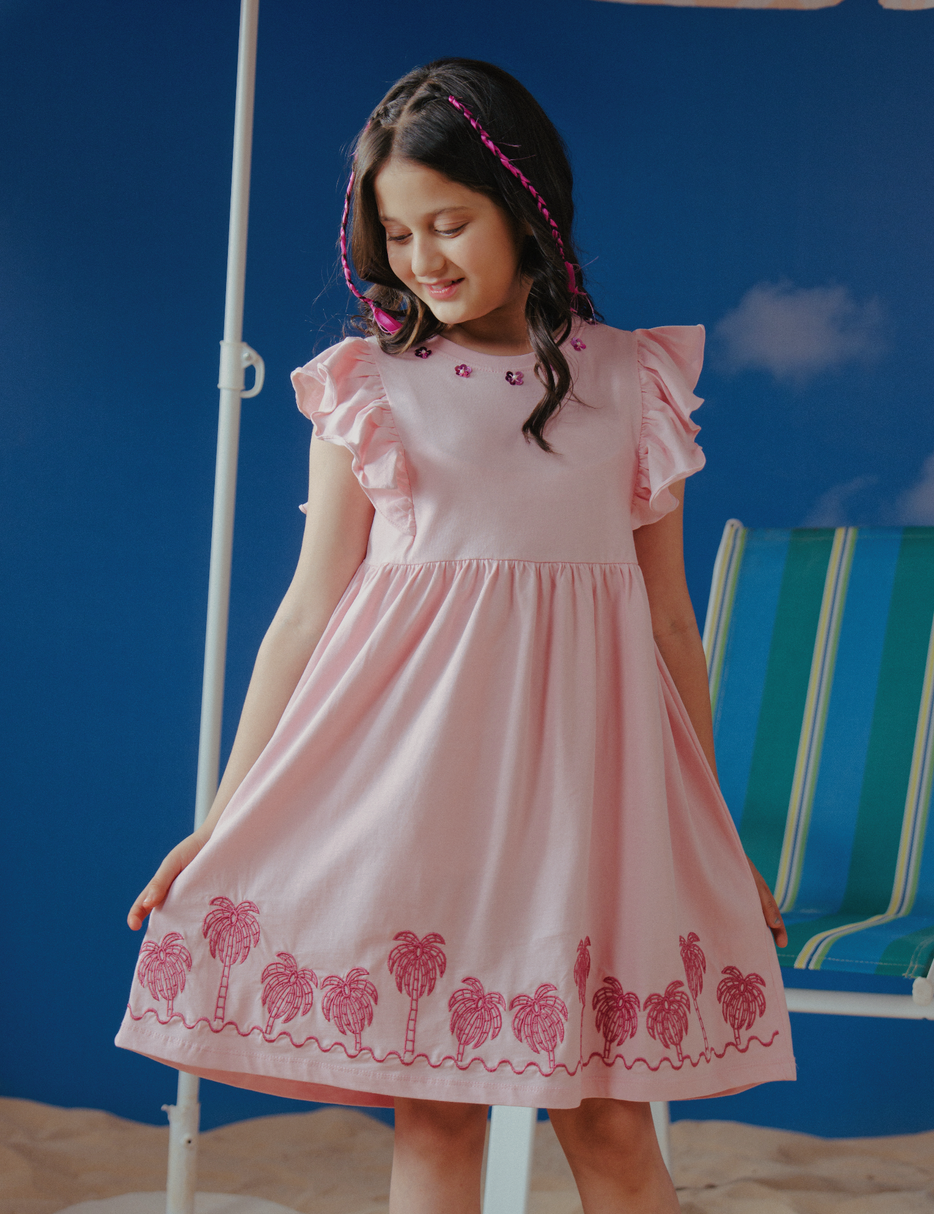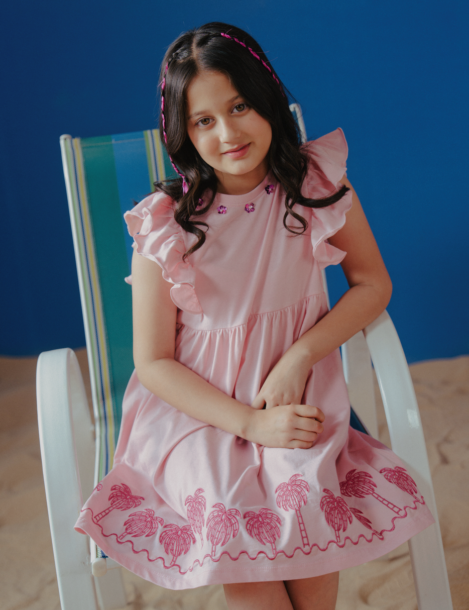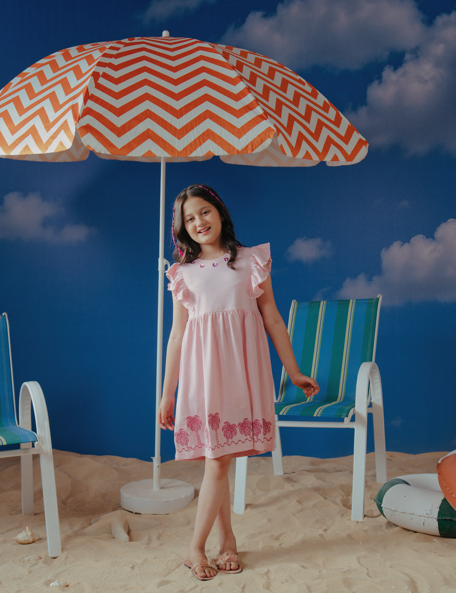 Bring sunny vibes to her wardrobe with this palm tree embroidered dress, perfect for beach days, vacations, or summer outings! Featuring delicate palm tree embroidery on soft, breathable fabric, this dress combines playful charm with effortless style. The lightweight material and flowy silhouette keep her cool and comfy all day, while the easy pullover design makes dressing simple. A fun and breezy choice for your little girl's warm-weather adventures!