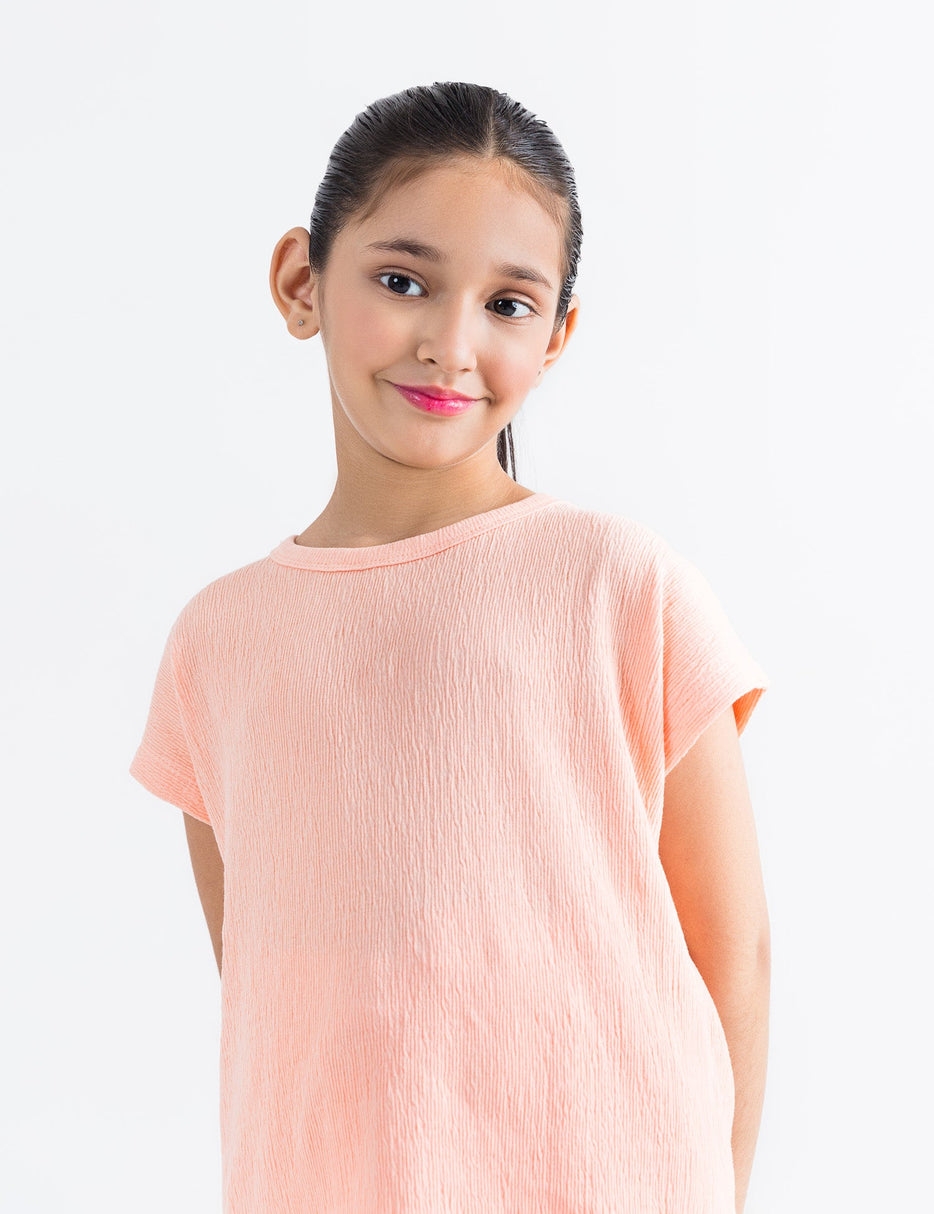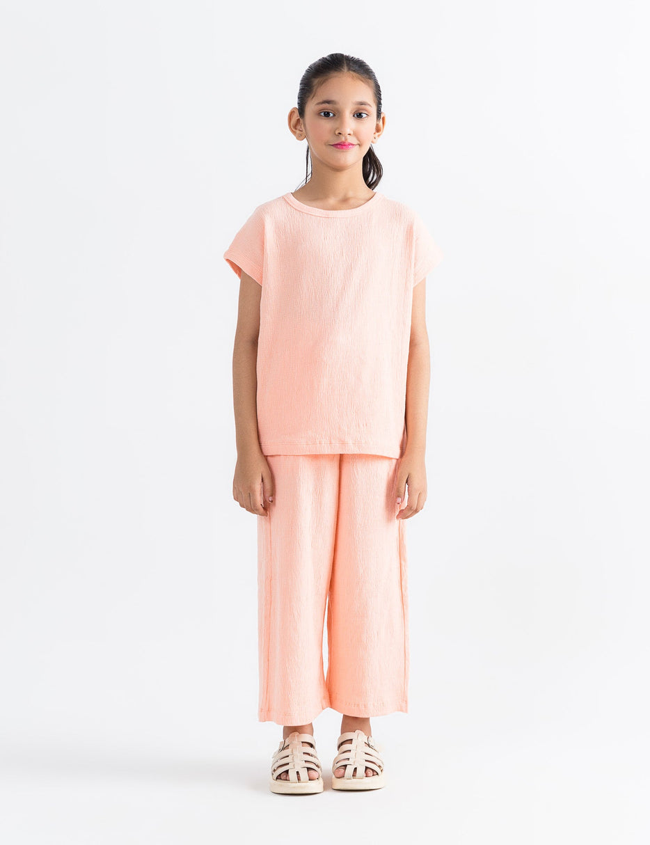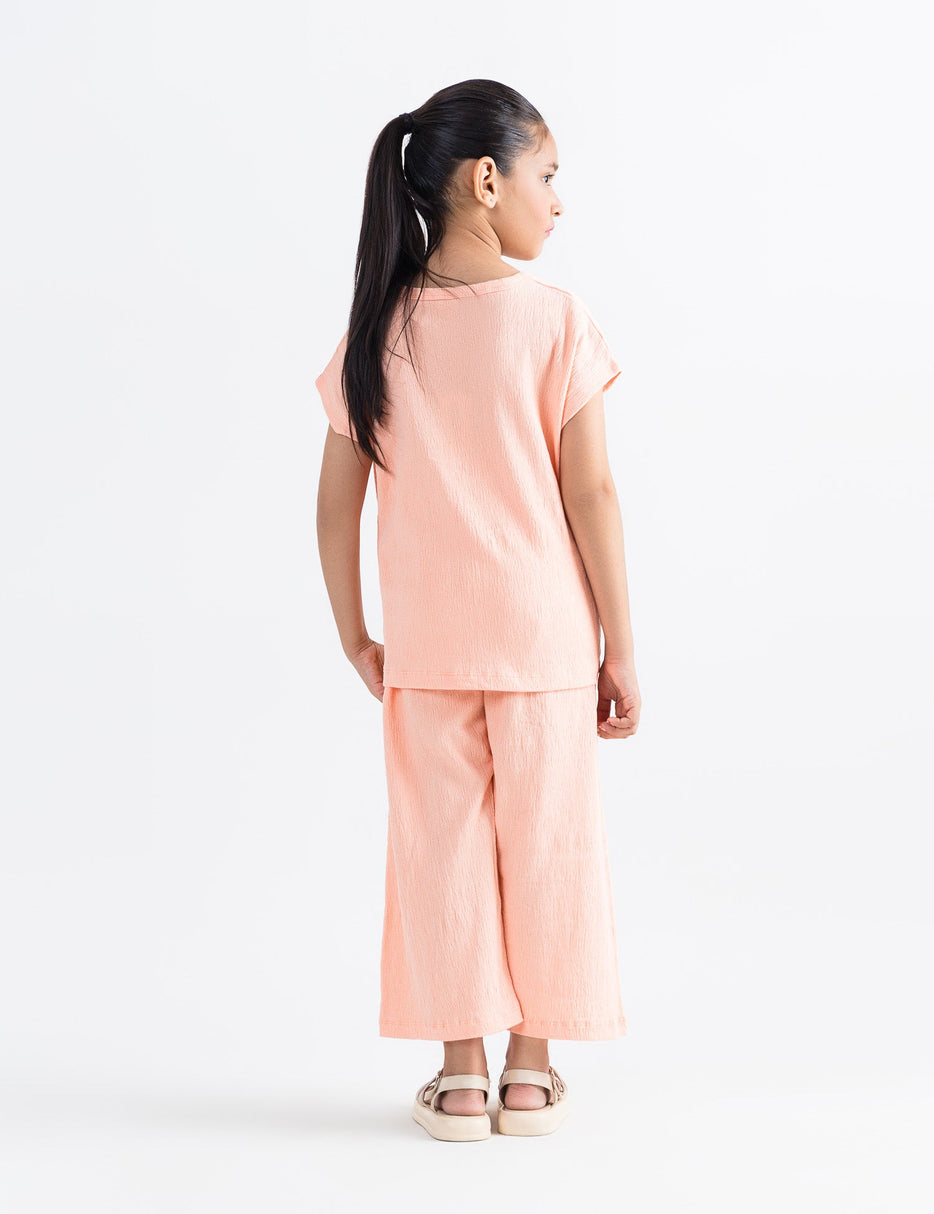 Simple, soft, and stylish—this 2-piece co-ord set in a soothing peach tone is perfect for relaxed days and casual outings. The set features a short-sleeve top with a round neckline and a clean, minimal look, paired with matching wide-leg trousers that offer a comfortable fit with an elastic waistband and drawstring. Made from lightweight, breathable fabric, this outfit is great for all-day wear while keeping her effortlessly chic.