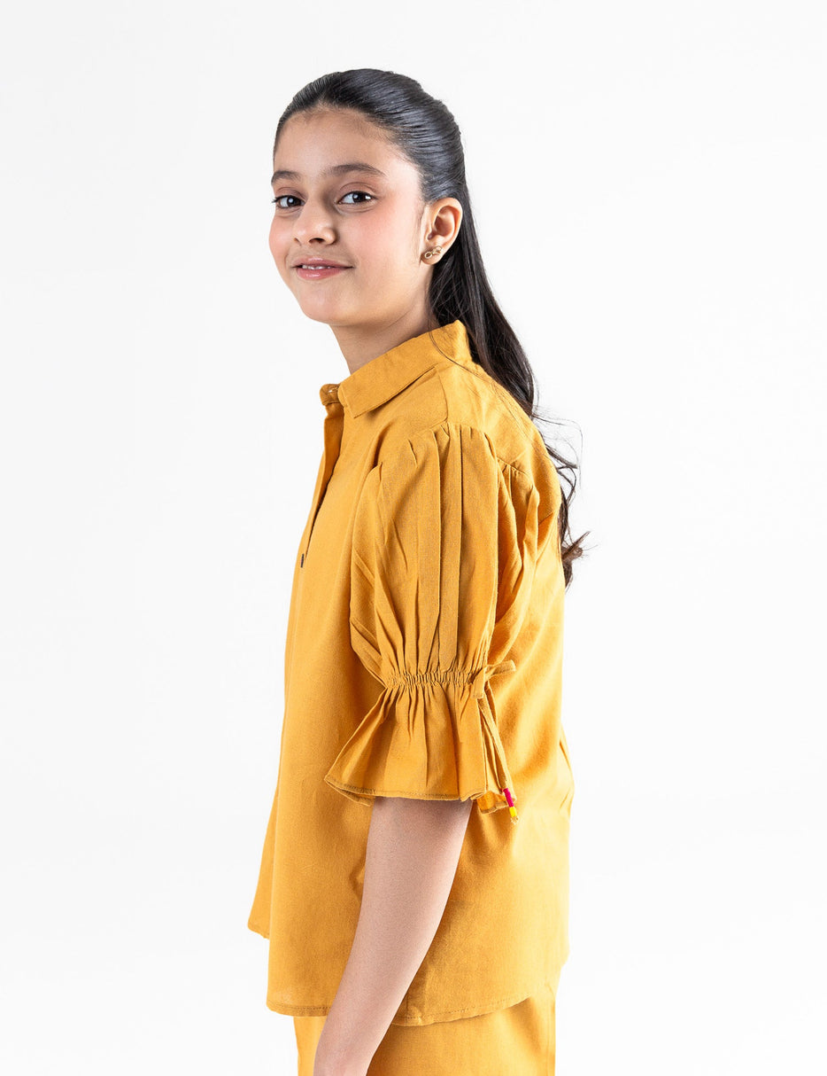 Elevate your Girl's wardrobe with this plain 2 piece suit featuring a button-down top with a collar and puff sleeves with a non-functional drawcord. Paired with straight-fit bottoms for a chic and elegant look.