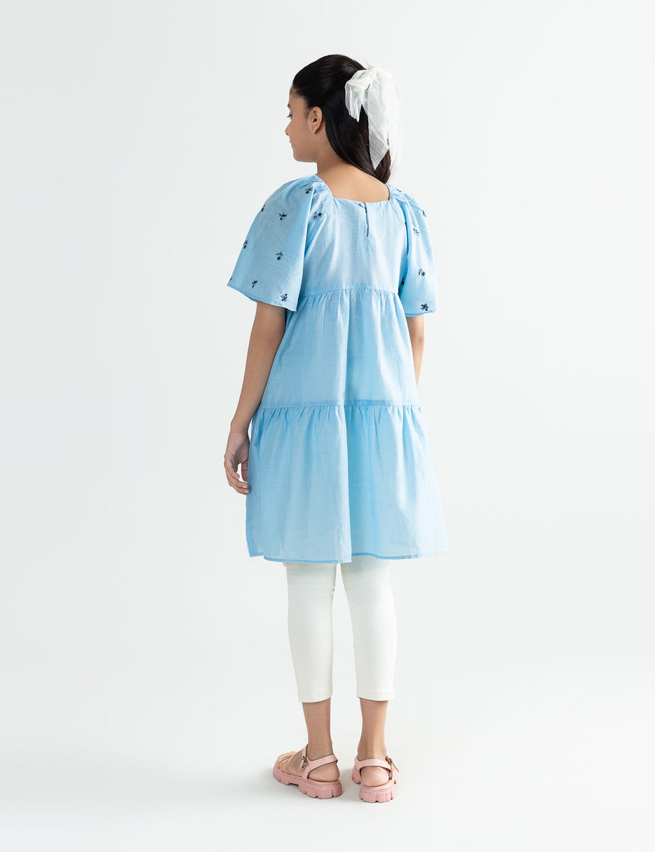 This Embroidered Tiered Dress for Girls is a perfect blend of elegance and comfort. Crafted in a soft pastel blue fabric, it features delicate floral embroidery all over for a graceful touch. The tiered silhouette and flutter sleeves add extra charm, making it ideal for casual outings, parties, or festive occasions. A stylish and breathable choice for your little fashionista’s wardrobe!