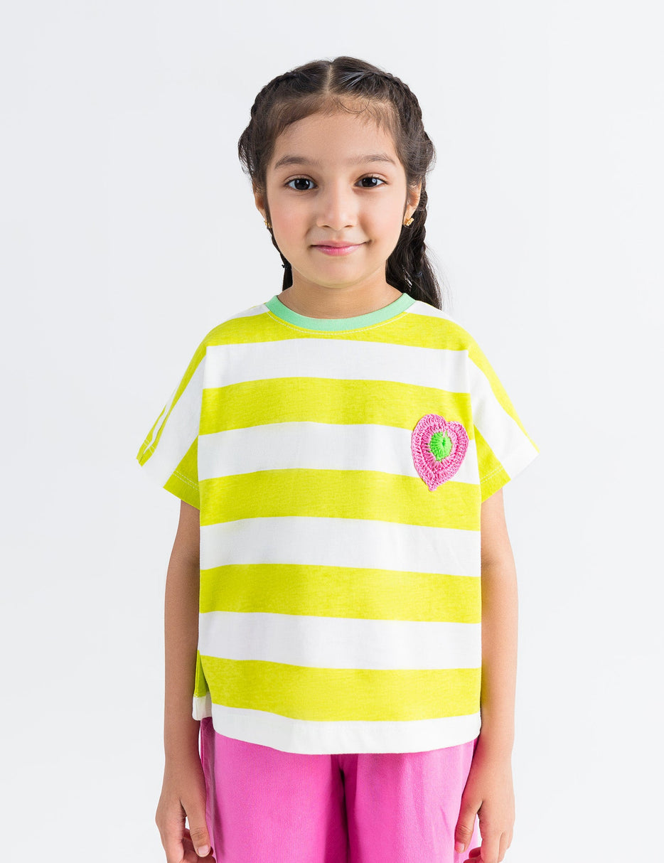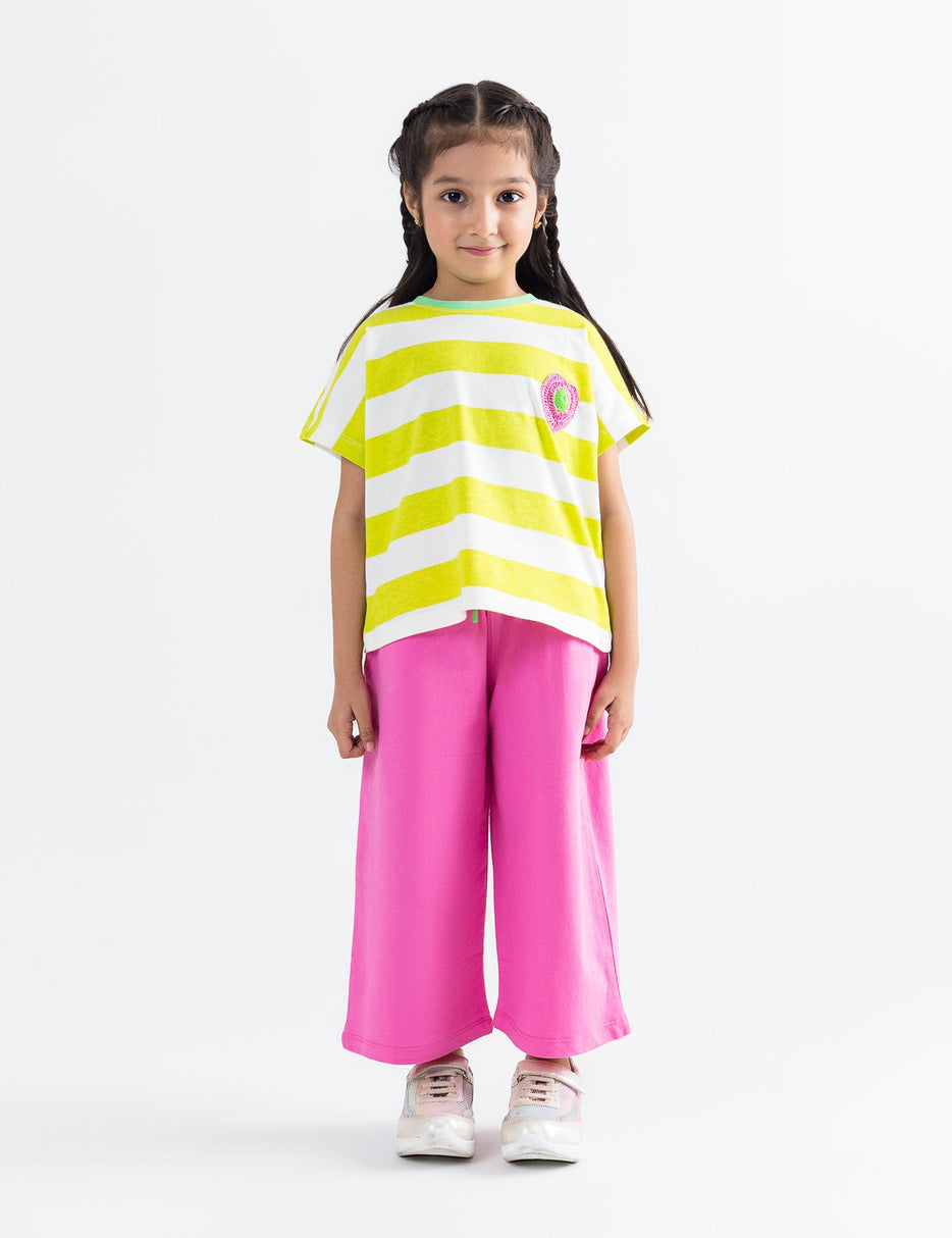 Fun, fresh, and full of color—this 2-piece set is a perfect pick for sunny day adventures! The outfit includes a lime green and white striped top with cap sleeves and an adorable crochet-style pink and green heart patch, paired with bright pink wide-leg trousers that feature a drawstring waist for comfort and style. Made from soft, breathable fabric, this set keeps her comfy and cute all day long.