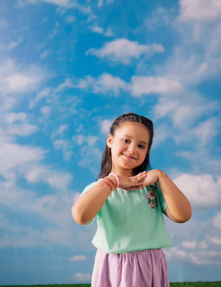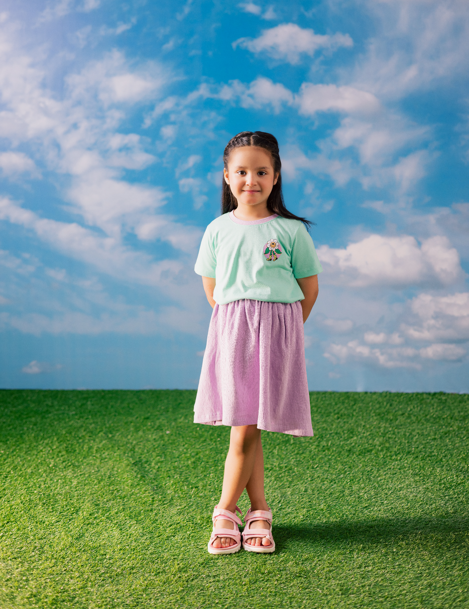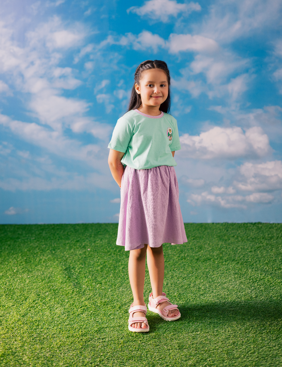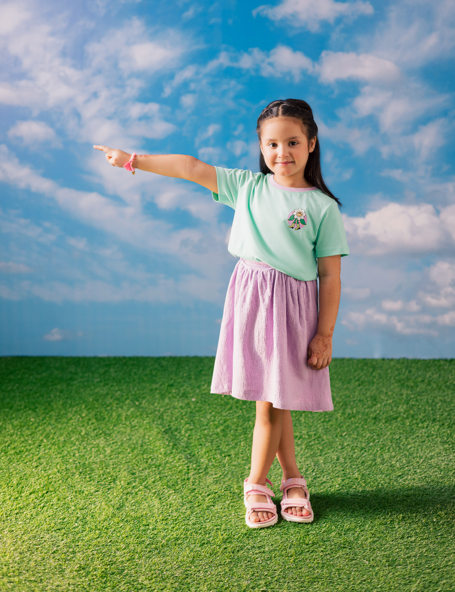 Sweet and playful, this 2-piece dress-style suit for little girls features a mint green top with a cute floral patch graphic and contrasting lavender neckline. Paired with a matching lavender skirt, this set offers a fun, coordinated look that's perfect for playdates, outings, or casual days. Made from soft, breathable fabric, it ensures all-day comfort and easy movement. A cheerful, comfy outfit that’s as adorable as it is practical!