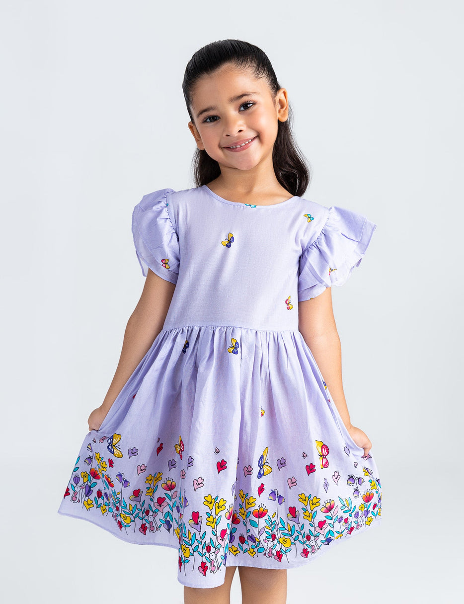 Let her charm everyone in this adorable butterfly and floral printed dress! Designed in a soft lavender tone, this dress features delicate butterfly prints on the bodice and flutter sleeves, and a vibrant floral and butterfly border print along the hem for a whimsical touch. Crafted from lightweight, breathable fabric, it ensures all-day comfort and a twirl-worthy fit. Perfect for parties, playdates, or special occasions—this dress is as sweet and joyful as she is!