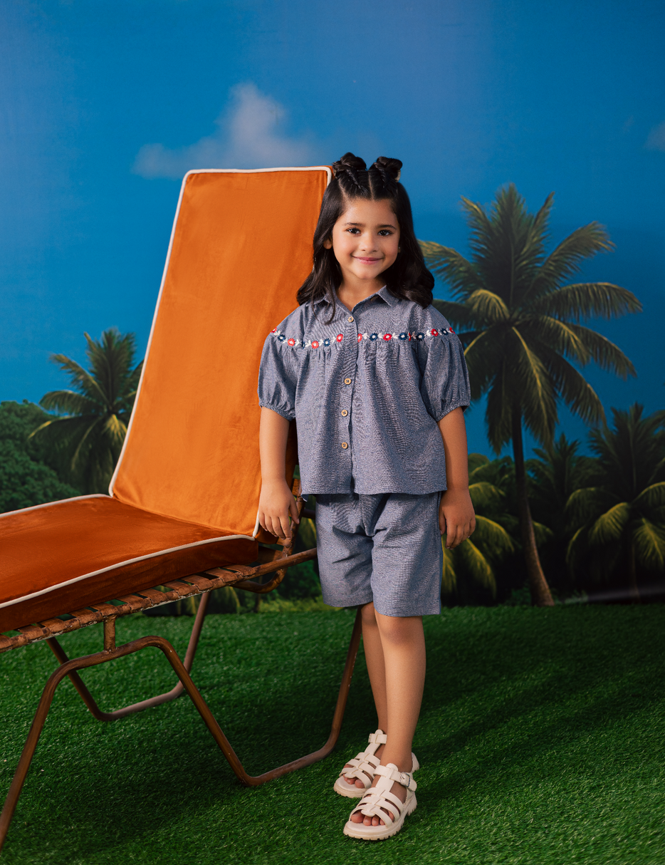 Chic and comfy, this 2-piece set features a stylish button-down top with delicate floral embroidery across the chest and puffed short sleeves for a sweet, girly touch. Made from lightweight, breathable fabric, the top pairs perfectly with the matching pleated shorts, designed for ease of movement and all-day comfort. Ideal for summer outings, playdates, or casual days, this coordinated set blends fashion and function effortlessly.