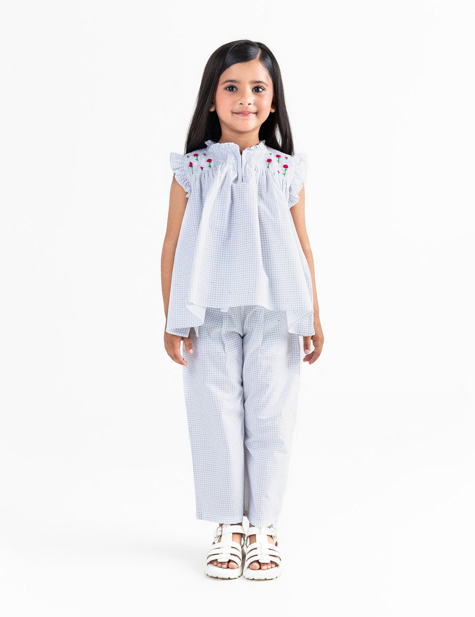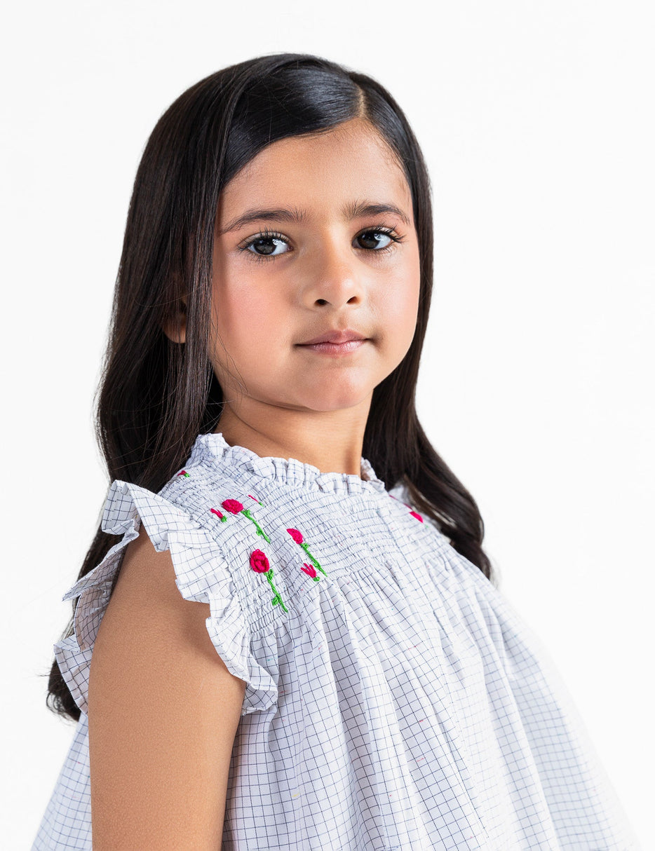 A floral embroidered top for little girls is a charming and delicate piece of clothing designed to add a touch of elegance and whimsy to a child's wardrobe. Typically made from soft, breathable fabrics like cotton, linen, or lightweight blends, the top features intricate floral embroidery that adds a feminine and playful vibe.