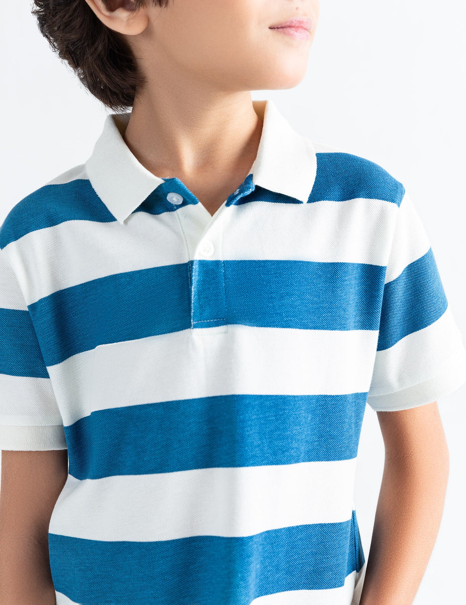 Keep it classic with this striped polo shirt for boys, featuring bold navy and white horizontal stripes. Made from soft, breathable pique fabric, it offers all-day comfort with a polished look. The ribbed collar and single-button placket add timeless charm, making it perfect for school, family outings, or casual days.