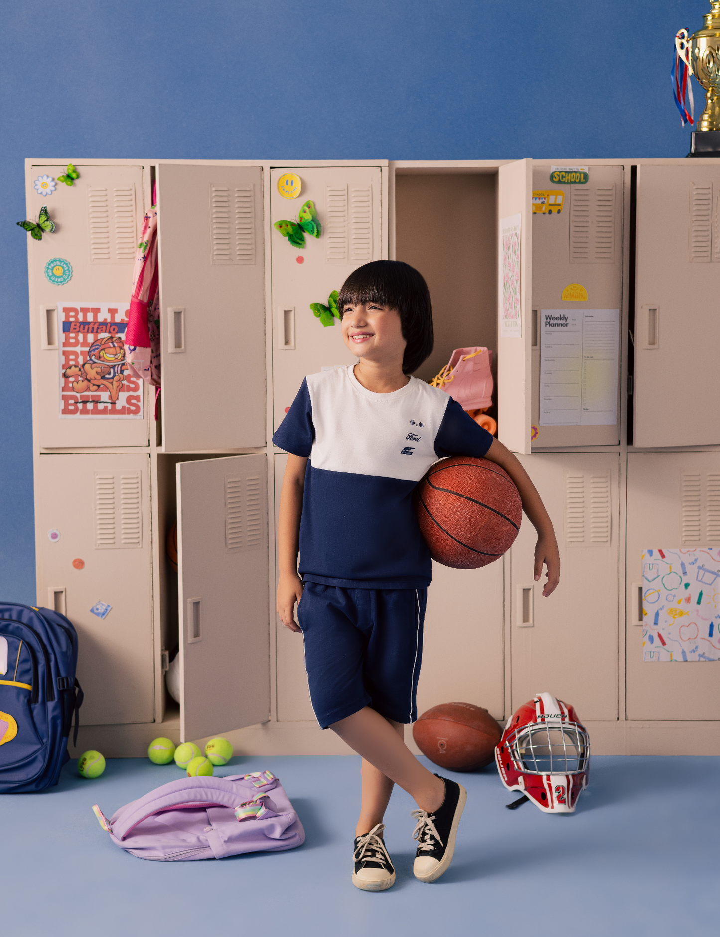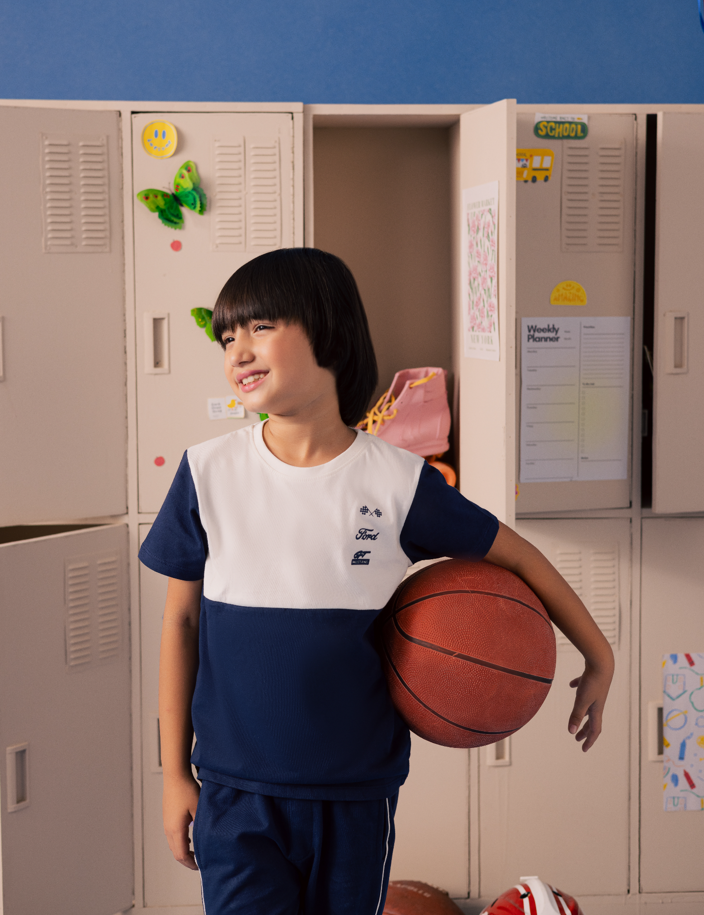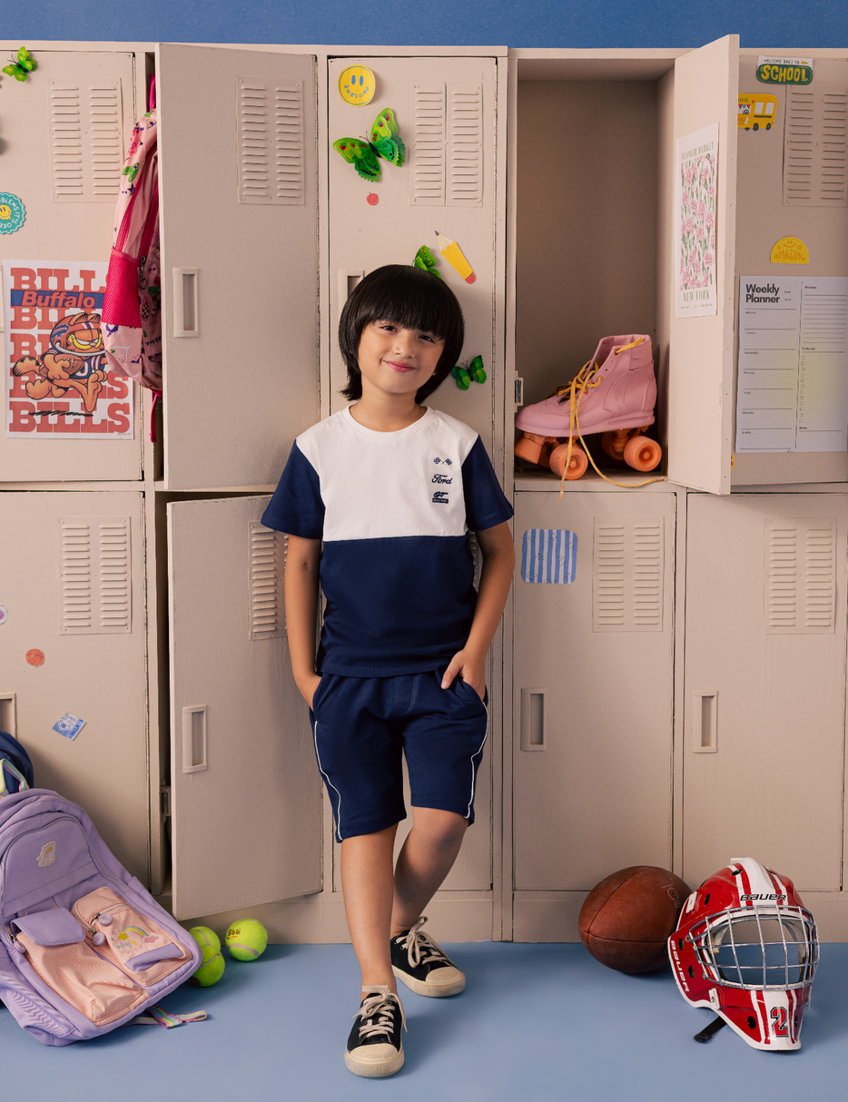 This stylish and comfy 2-piece set features a colorblock t-shirt in white and navy with a subtle "Ford" graphic detail, paired with solid navy basic knit shorts accented with white piping. The t-shirt offers a modern, sporty look, while the soft knit shorts provide all-day comfort with an elastic waistband and drawstring for a snug fit. Perfect for casual days, playtime, or summer outings, this set is a must-have for easy, everyday style!