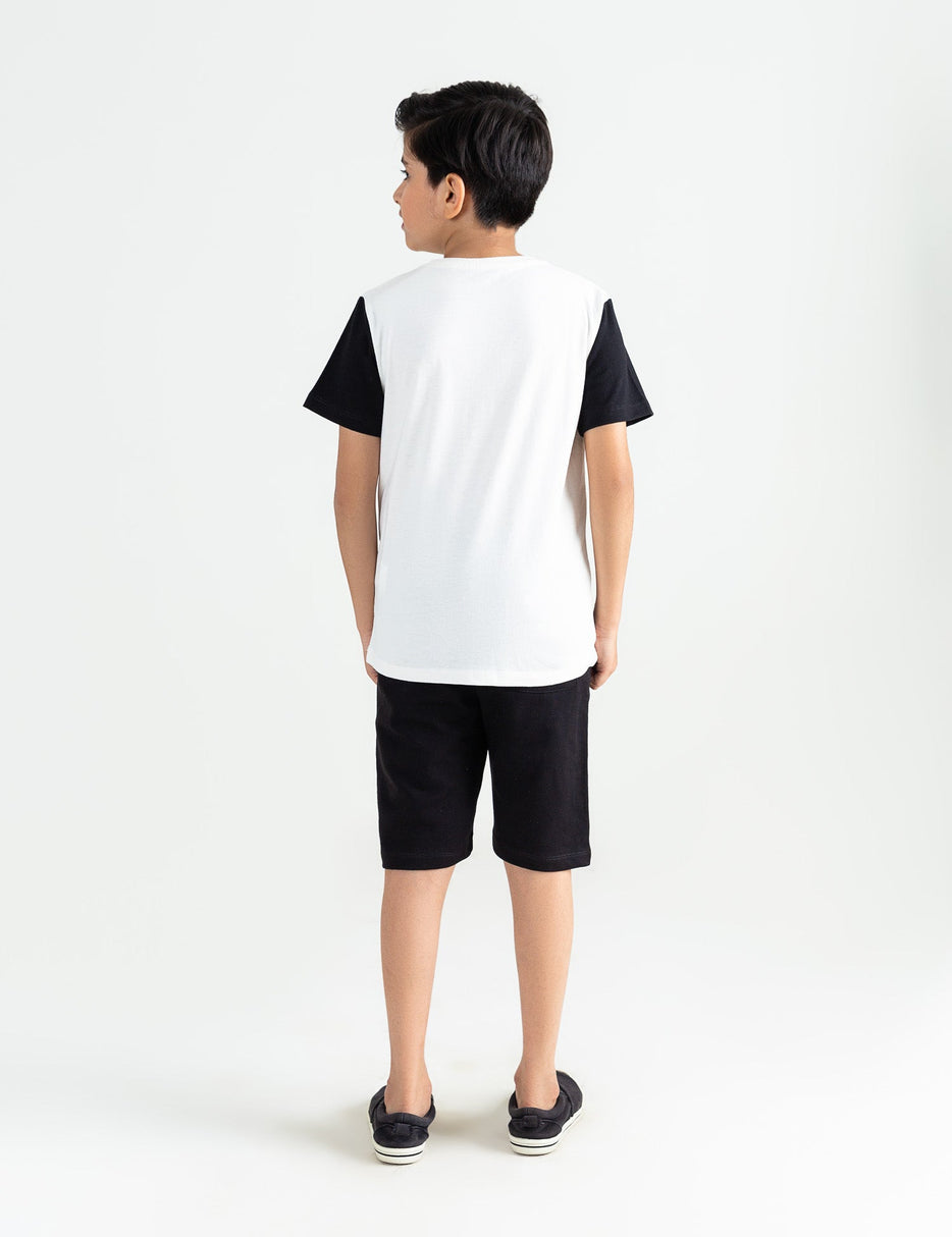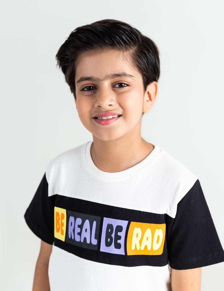 Let your boy stand out in style with this trendy "BE REAL BE RAD" printed t-shirt. Designed for comfort and attitude, this t-shirt features a bold, motivational slogan in vibrant block lettering across the chest. The unique color-block design combines a crisp white body with contrasting black sleeves and upper chest panel, making it a standout piece for casual wear.