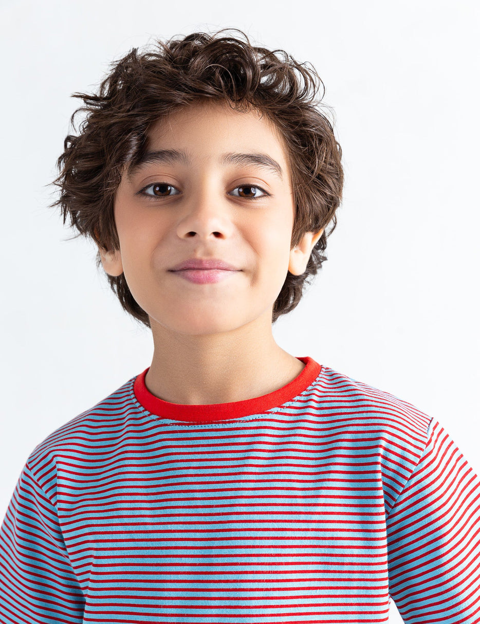This classic striped T-shirt for boys is a perfect everyday essential with a cool and casual vibe. Made from soft, breathable cotton, it features bold horizontal stripes and a comfortable crew neckline. Whether he’s off to school, a playdate, or just hanging out, this tee is an easy go-to for effortless style and comfort.