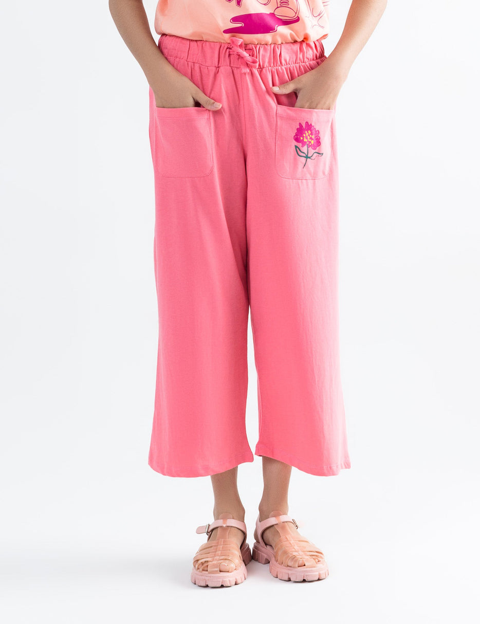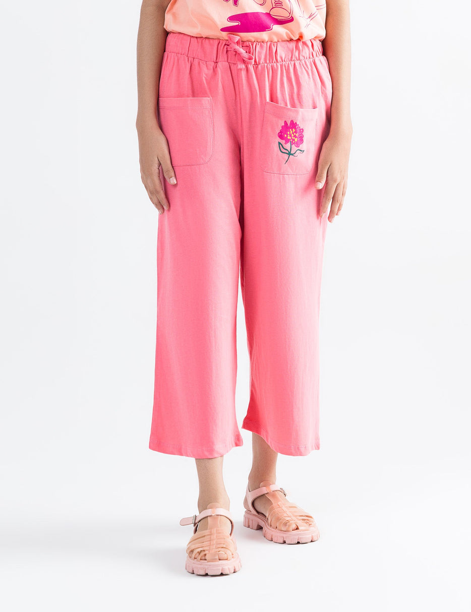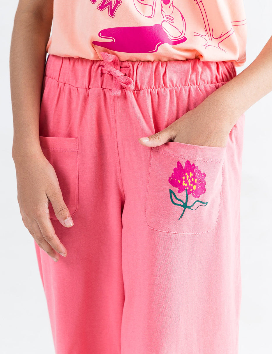 Add a fresh and playful touch to her wardrobe with these floral printed trousers for girls. Designed with a floral print on front pocket, these trousers bring charm and color to any outfit. Made from lightweight, breathable fabric, they offer all-day comfort and easy movement. The elastic waistband ensures a snug, flexible fit, making them perfect for school, outings, or weekend fun. Pair them with a solid top for a balanced and stylish look!