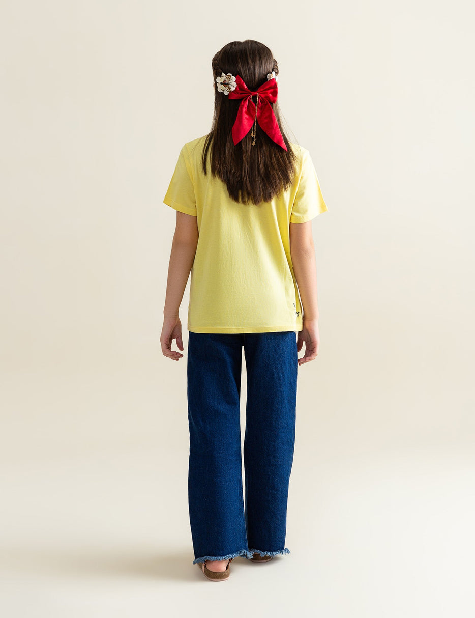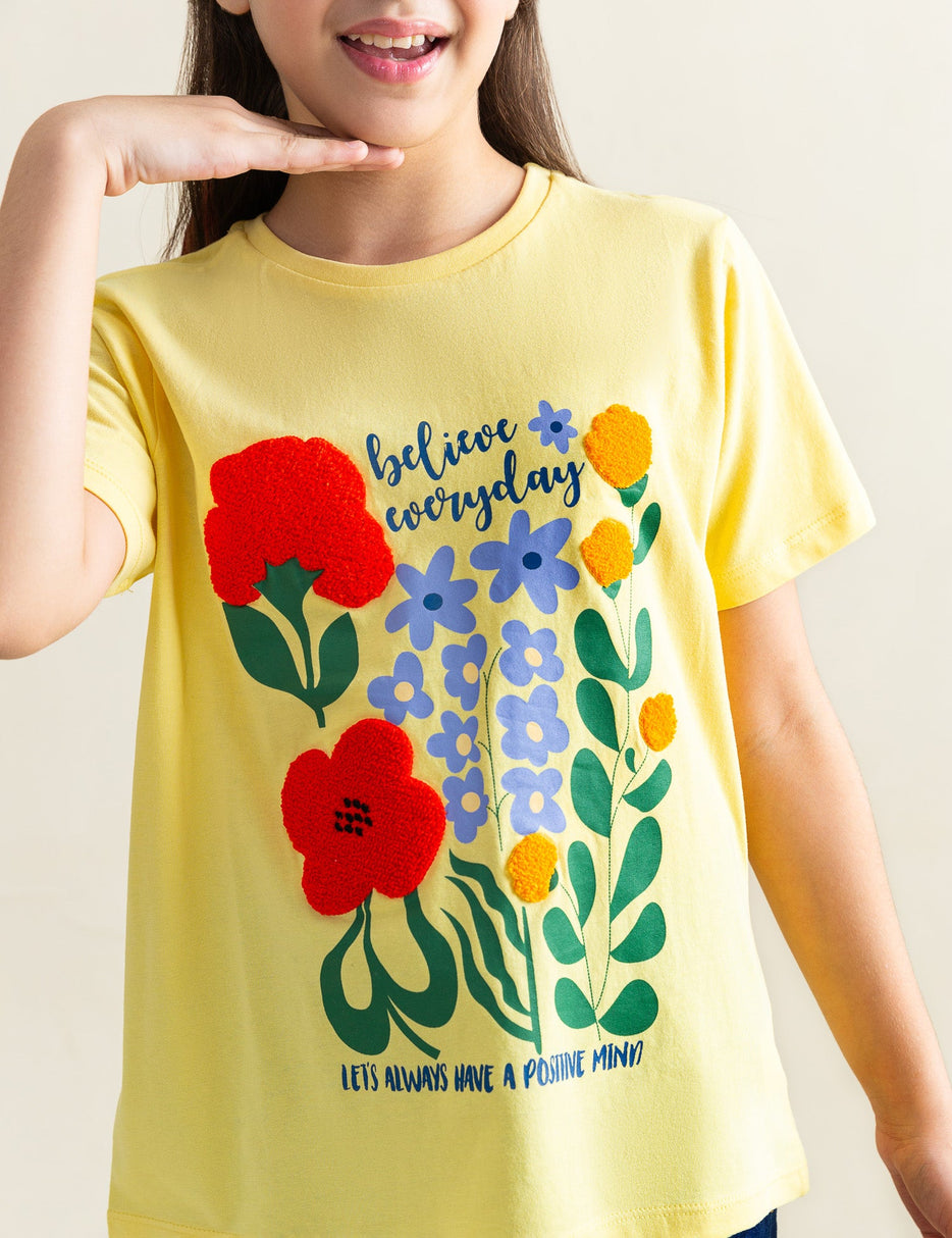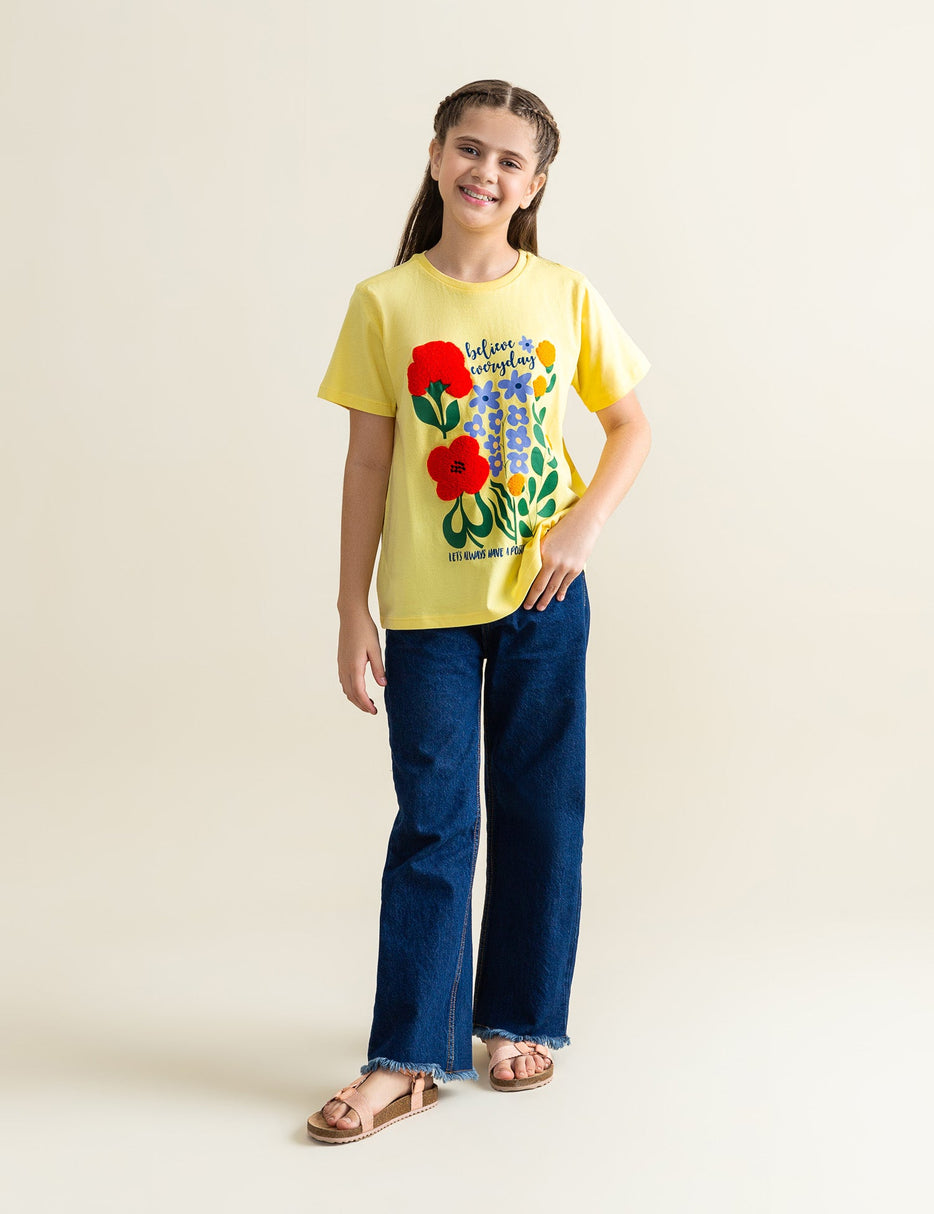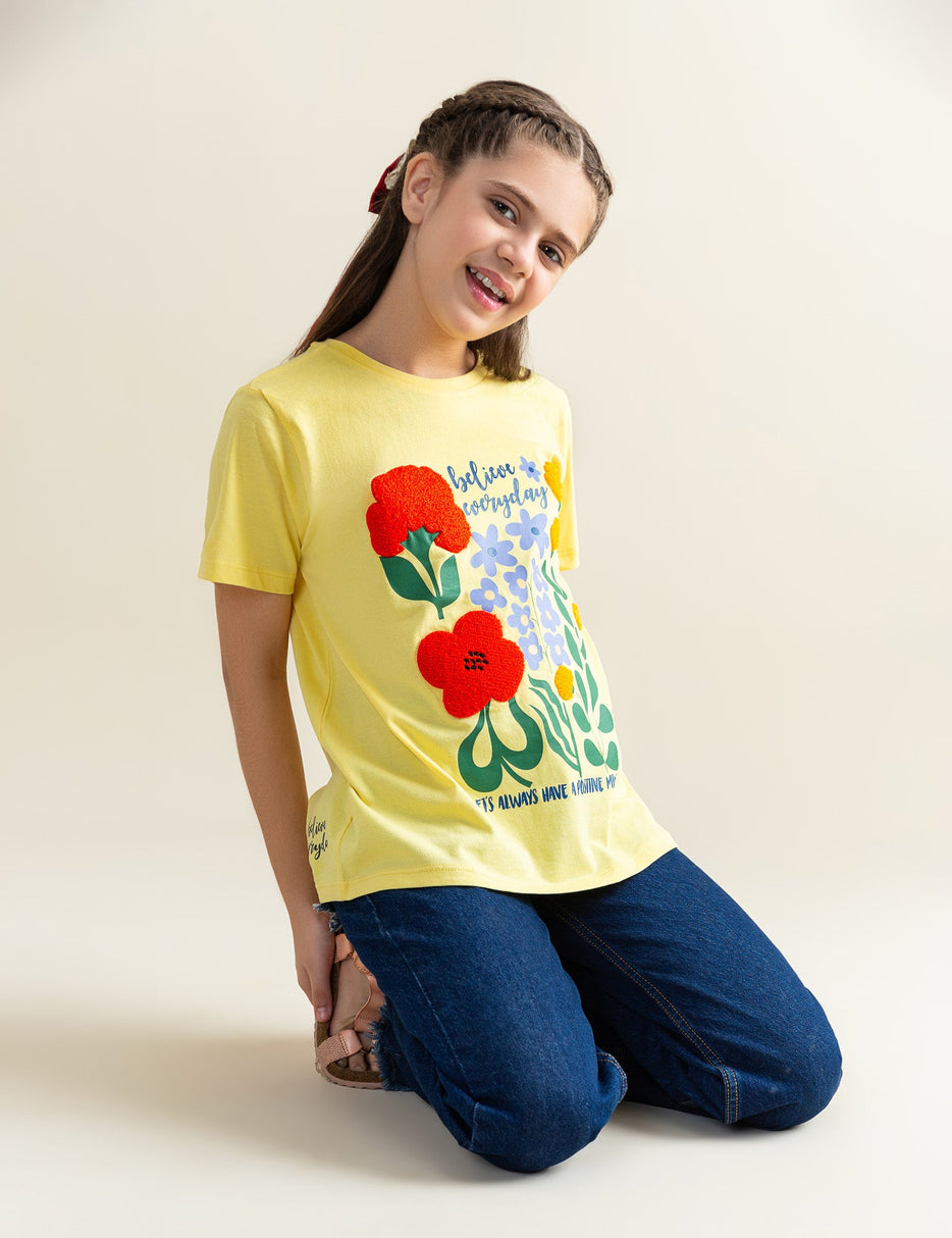 Add a playful twist to her casual style with this towel embroidered T-shirt. Featuring soft, textured embroidery that pops with color and charm, it brings a fun, tactile element to her outfit. Made from breathable, comfortable fabric, it’s perfect for all-day wear, while the classic crew neckline and short sleeves make it easy to pair with skirts, shorts, or jeans for a cute and casual look.