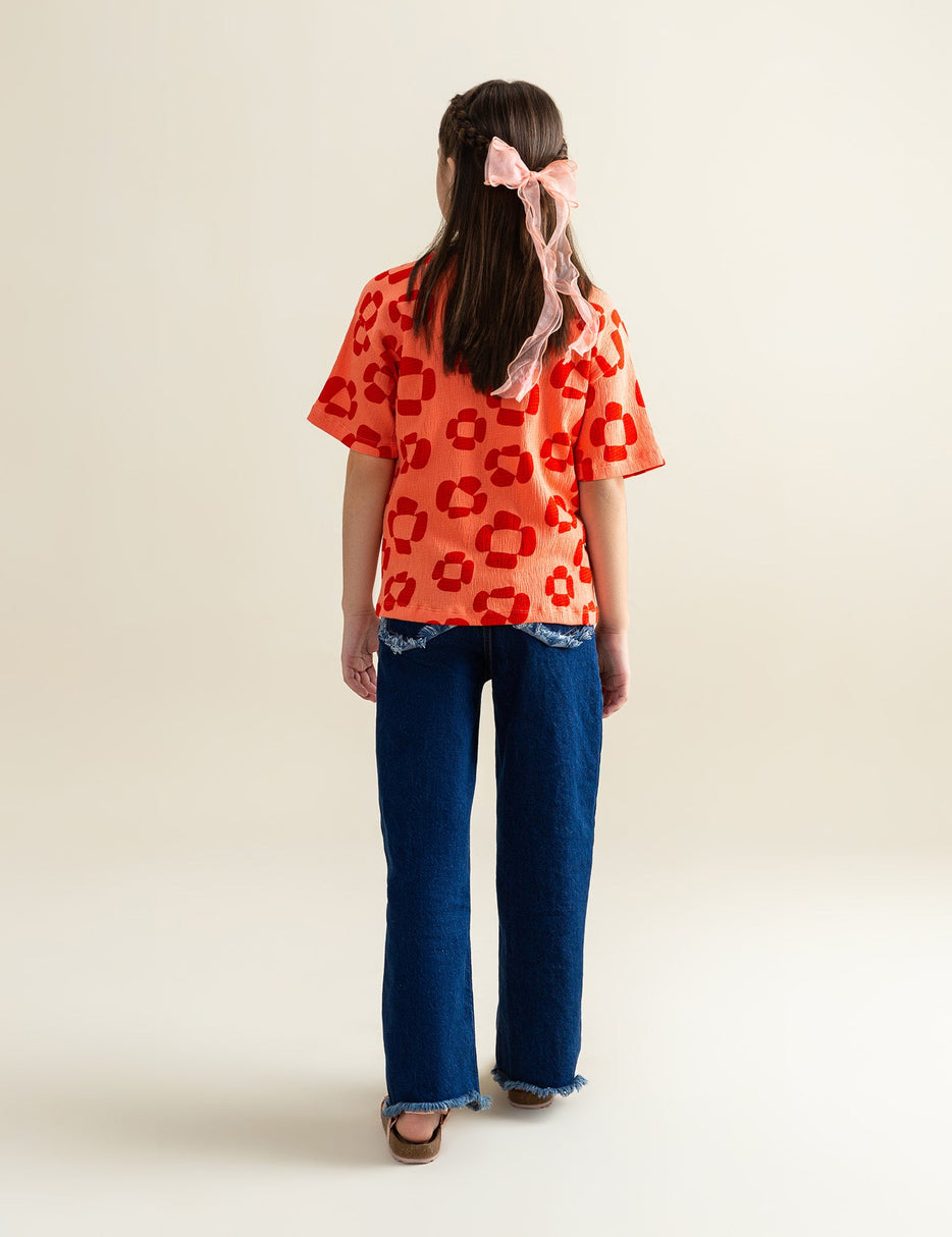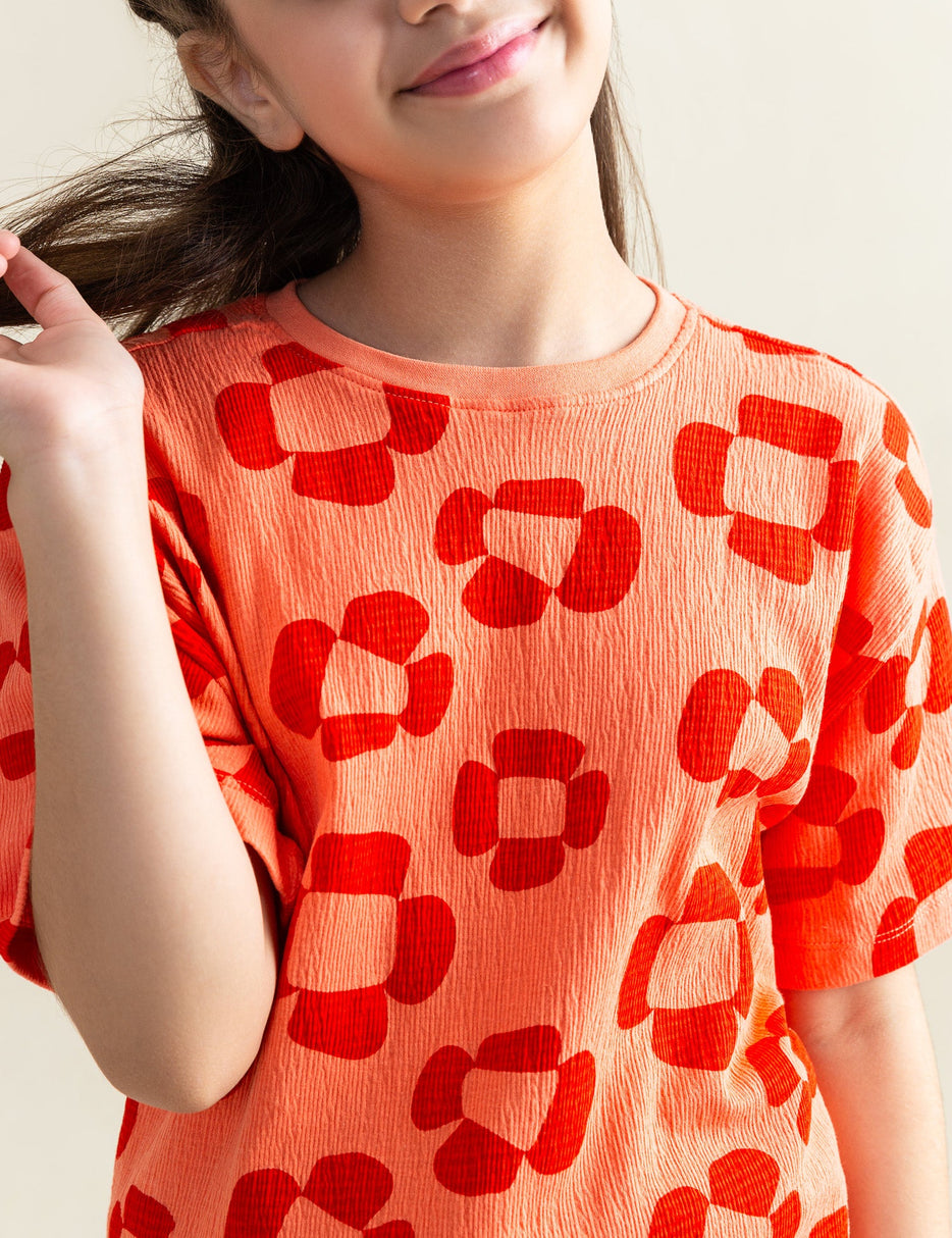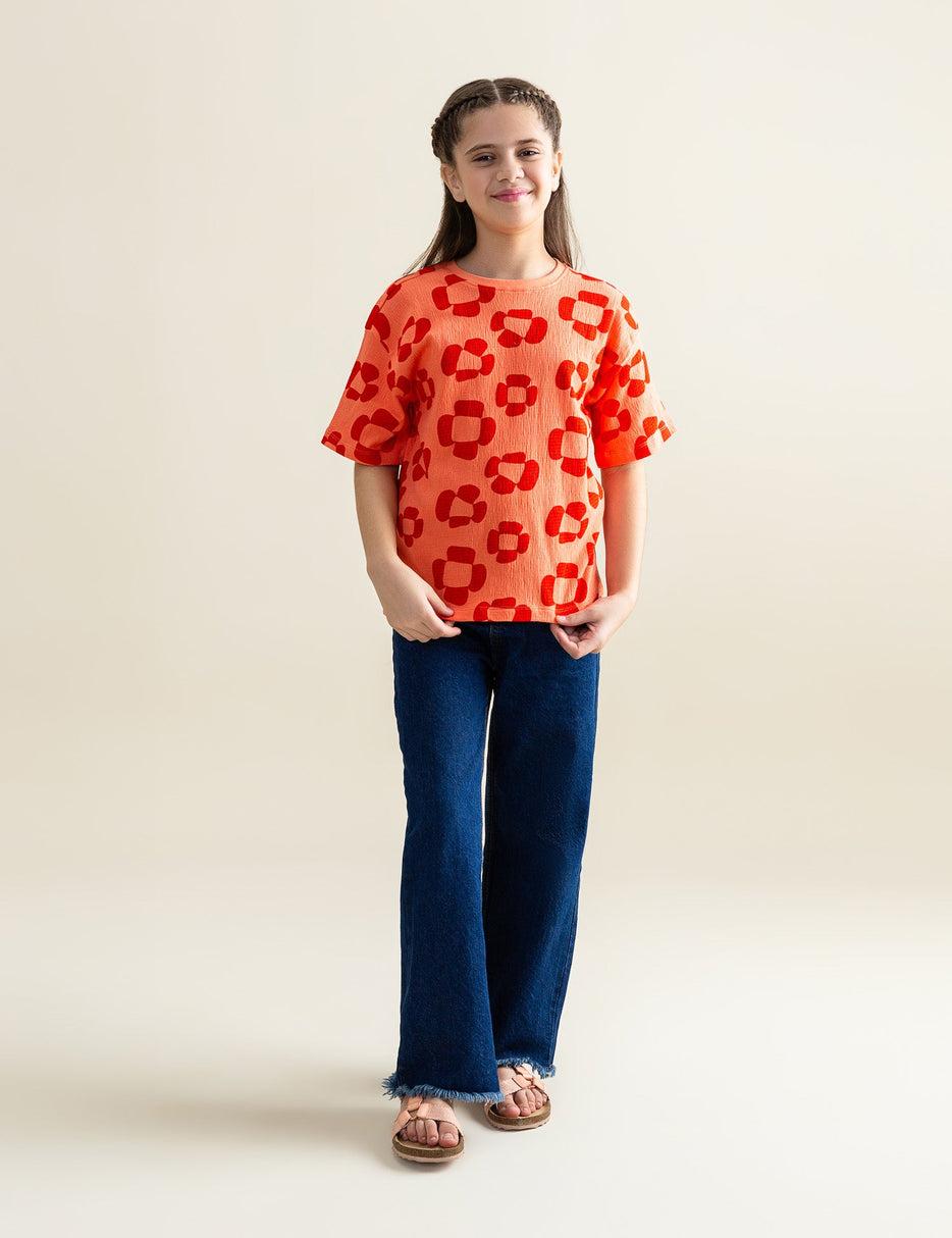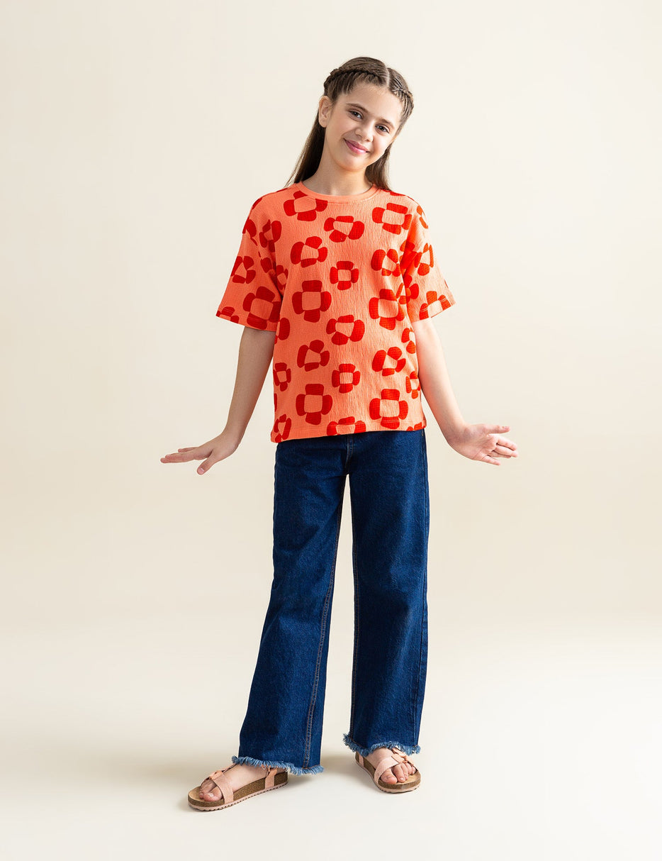 Brighten up her everyday wardrobe with this charming floral printed T-shirt. Adorned with a lively, colorful flower pattern, it brings a fresh and cheerful vibe to any outfit. Crafted from soft, breathable fabric, it ensures all-day comfort, while the classic crew neckline and short sleeves make it perfect for pairing with jeans, skirts, or shorts for a sweet and stylish look.