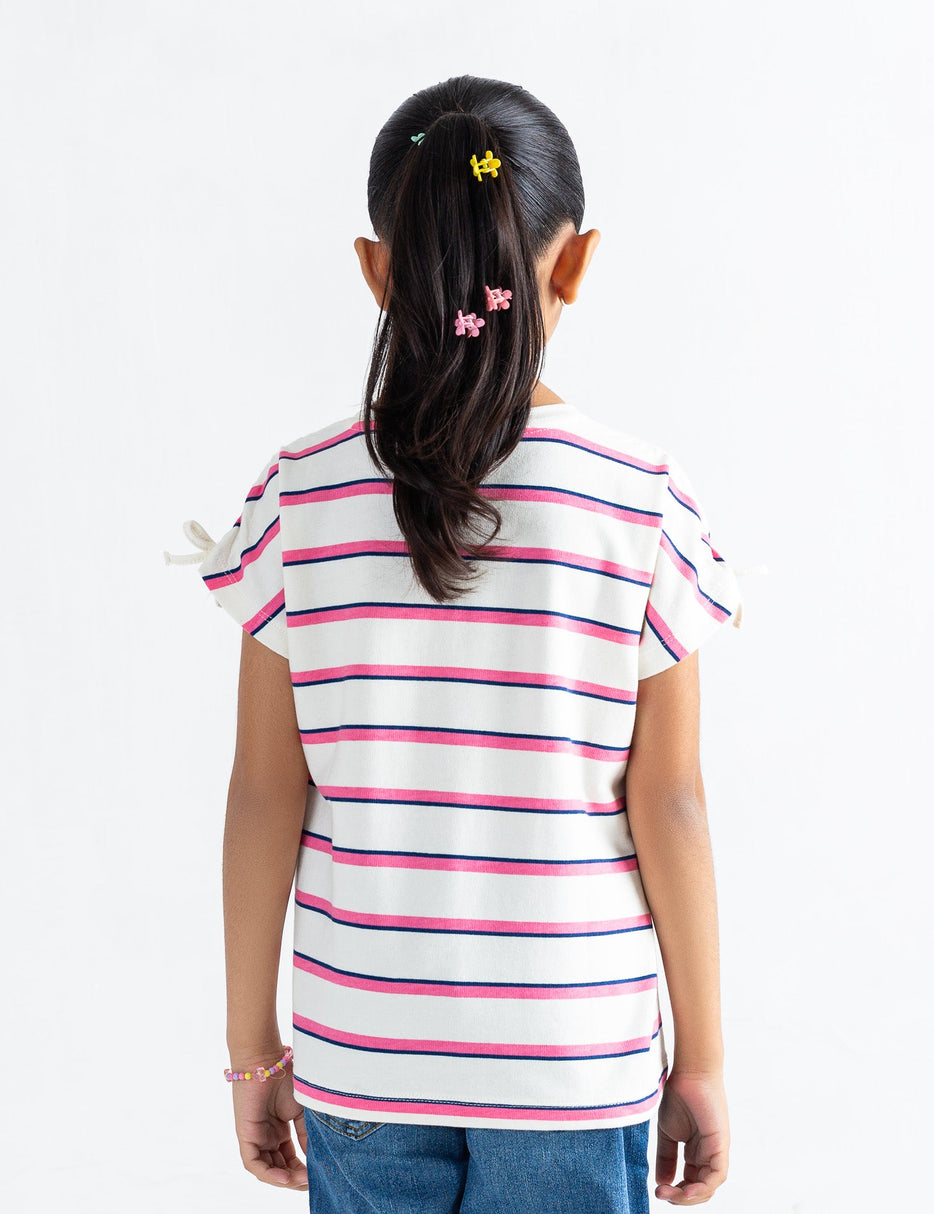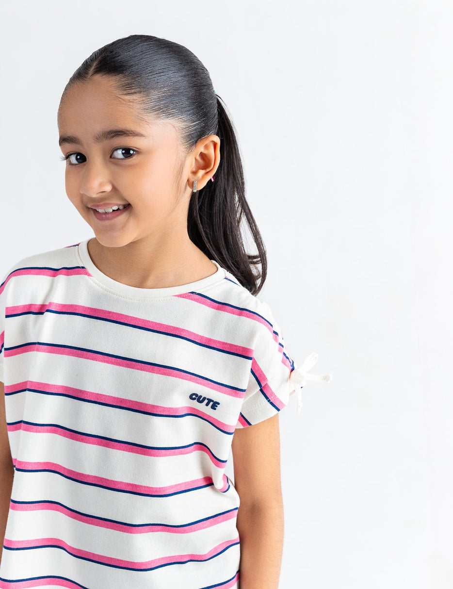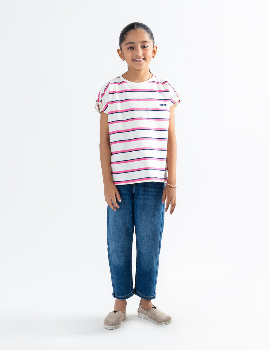 Add a touch of charm to her everyday look with this embroidered striped t-shirt for girls. Featuring classic horizontal stripes and delicate embroidery detail on the chest, this tee blends timeless style with a playful twist. Crafted from soft, breathable fabric, it’s perfect for school, playdates, or casual outings.