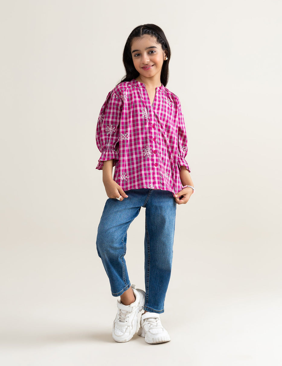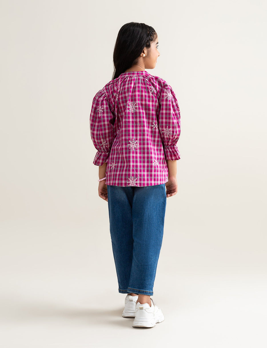 Add timeless charm to her wardrobe with this Embroidered Button-Down Checkered Top for Girls. Featuring a classic checkered pattern and delicate embroidery details, this top blends casual style with a touch of elegance. The button-down front makes it easy to wear, while the lightweight, breathable fabric keeps her comfortable throughout the day. Perfect for school days, family outings, or special occasions.