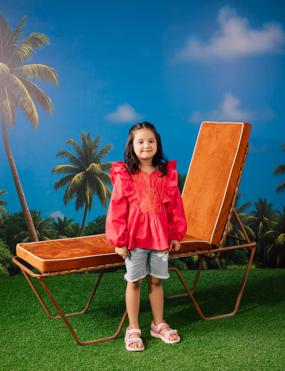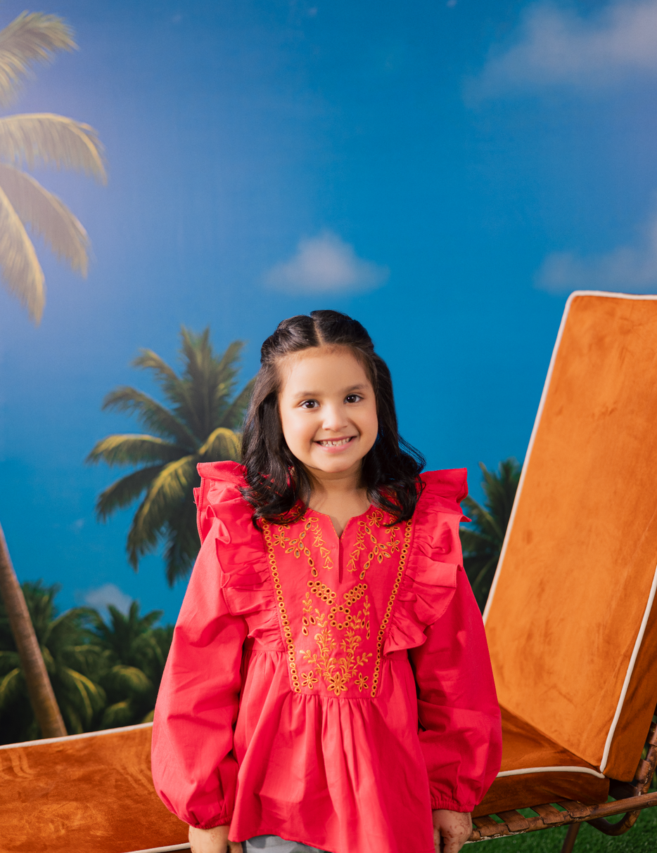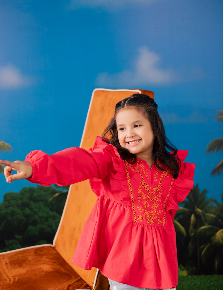 Delicate and stylish, this floral embroidered top for girls adds a touch of elegance to her everyday look. Featuring intricate floral embroidery on soft, breathable fabric, it blends comfort with timeless charm. Designed with a round neckline and gathered sleeves, this top pairs perfectly with jeans, leggings, or skirts for casual outings or dressy occasions. A sweet staple for her wardrobe!