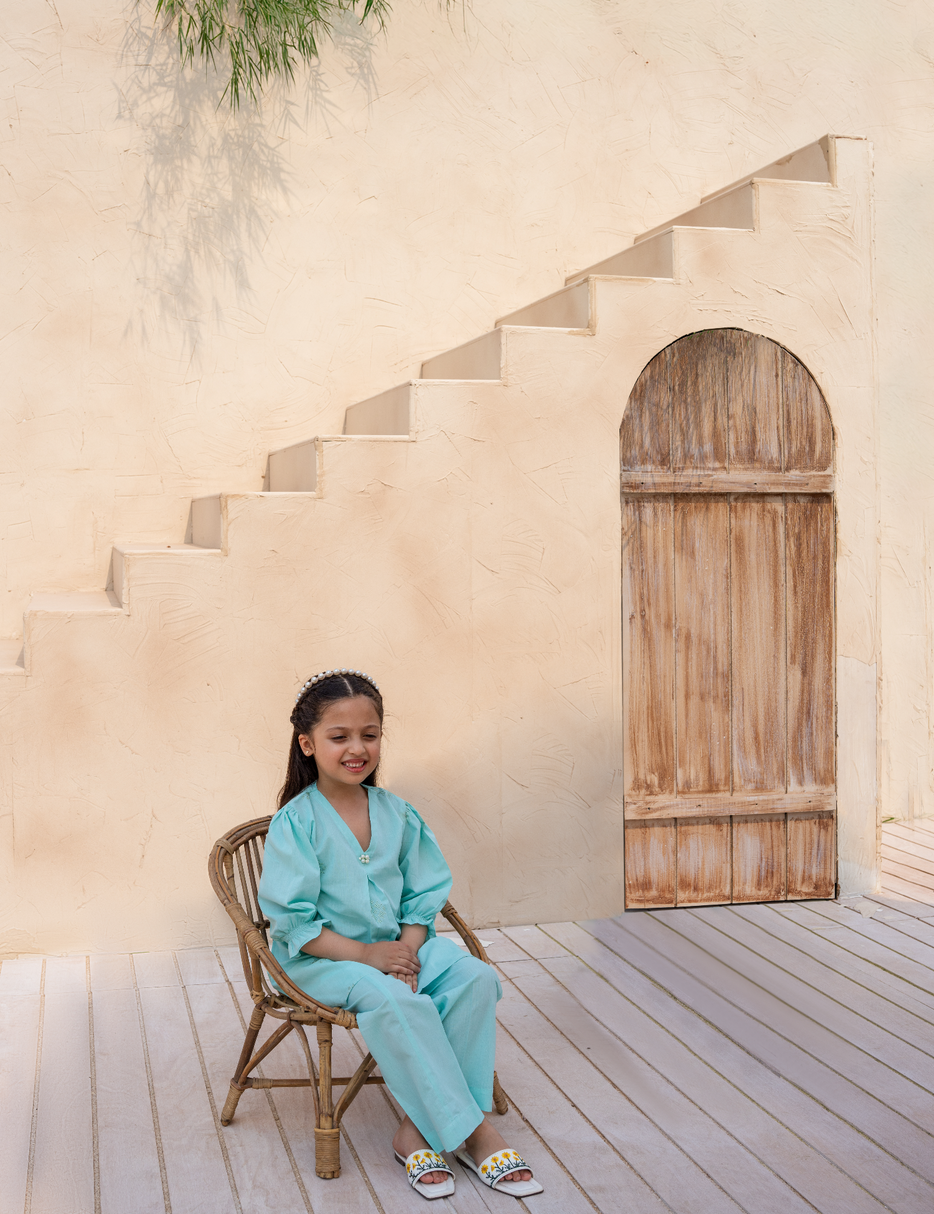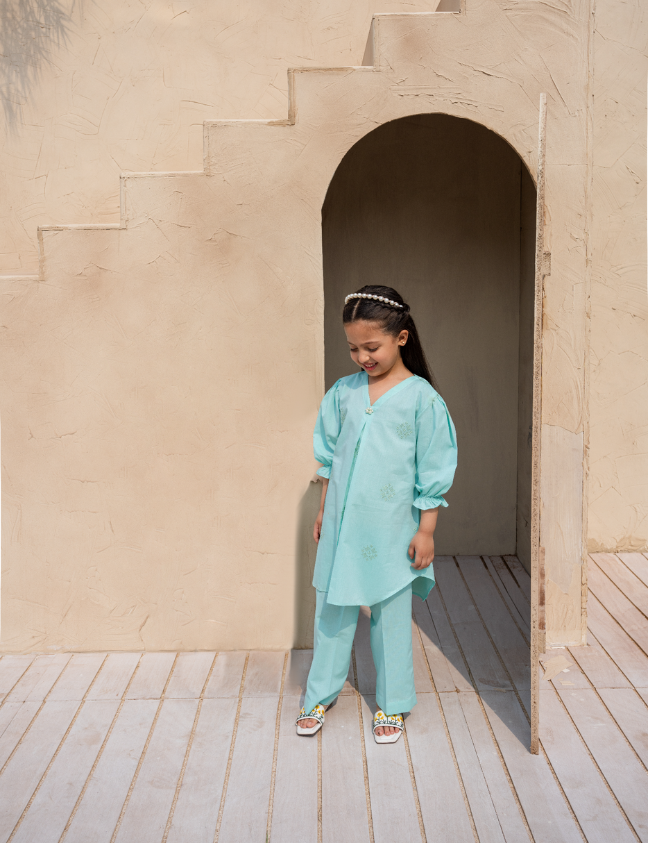 Gorgeous color fabric is designed with love and cross stitch embroidery detail. Paired with matching trouser. Must have this for summer festive season.