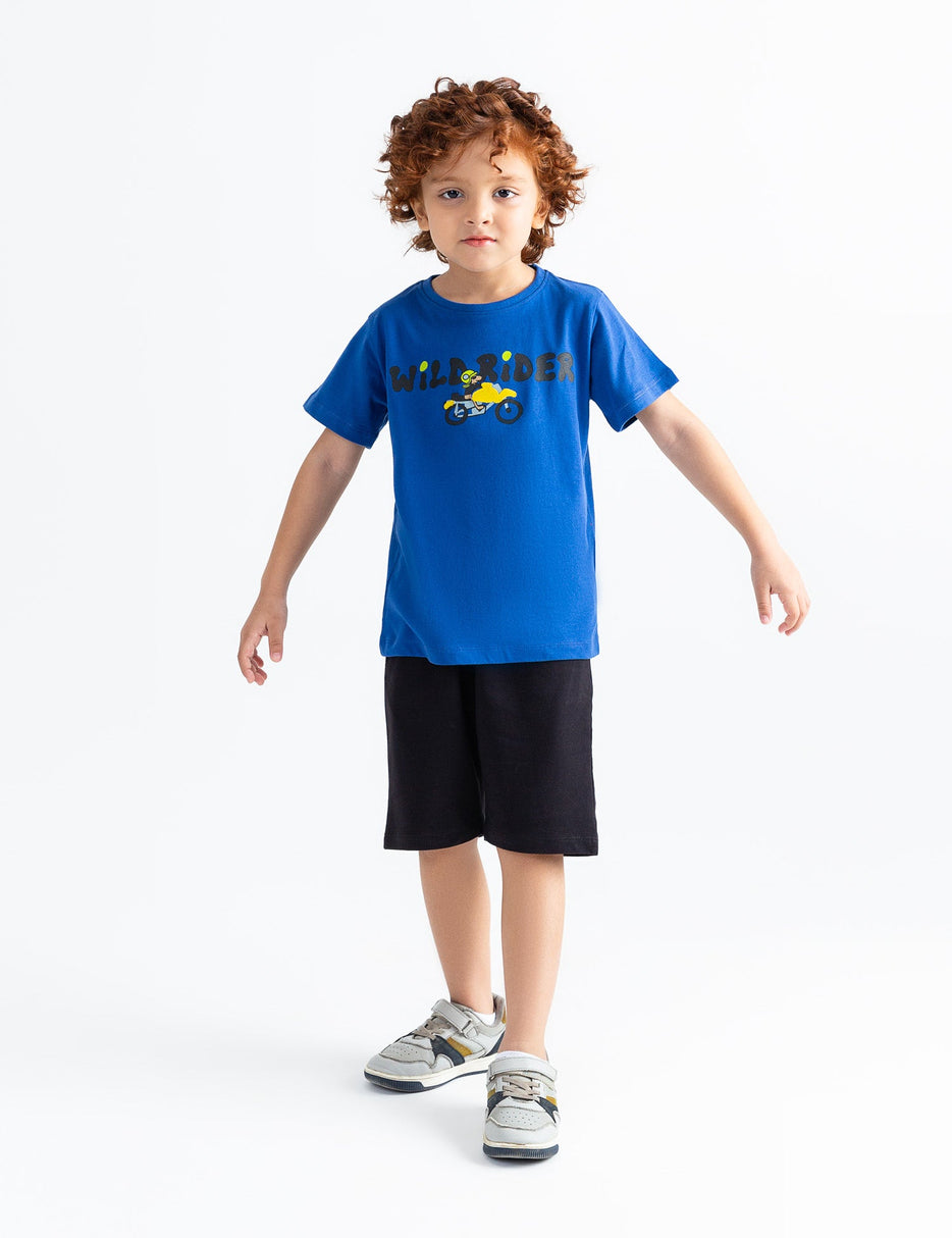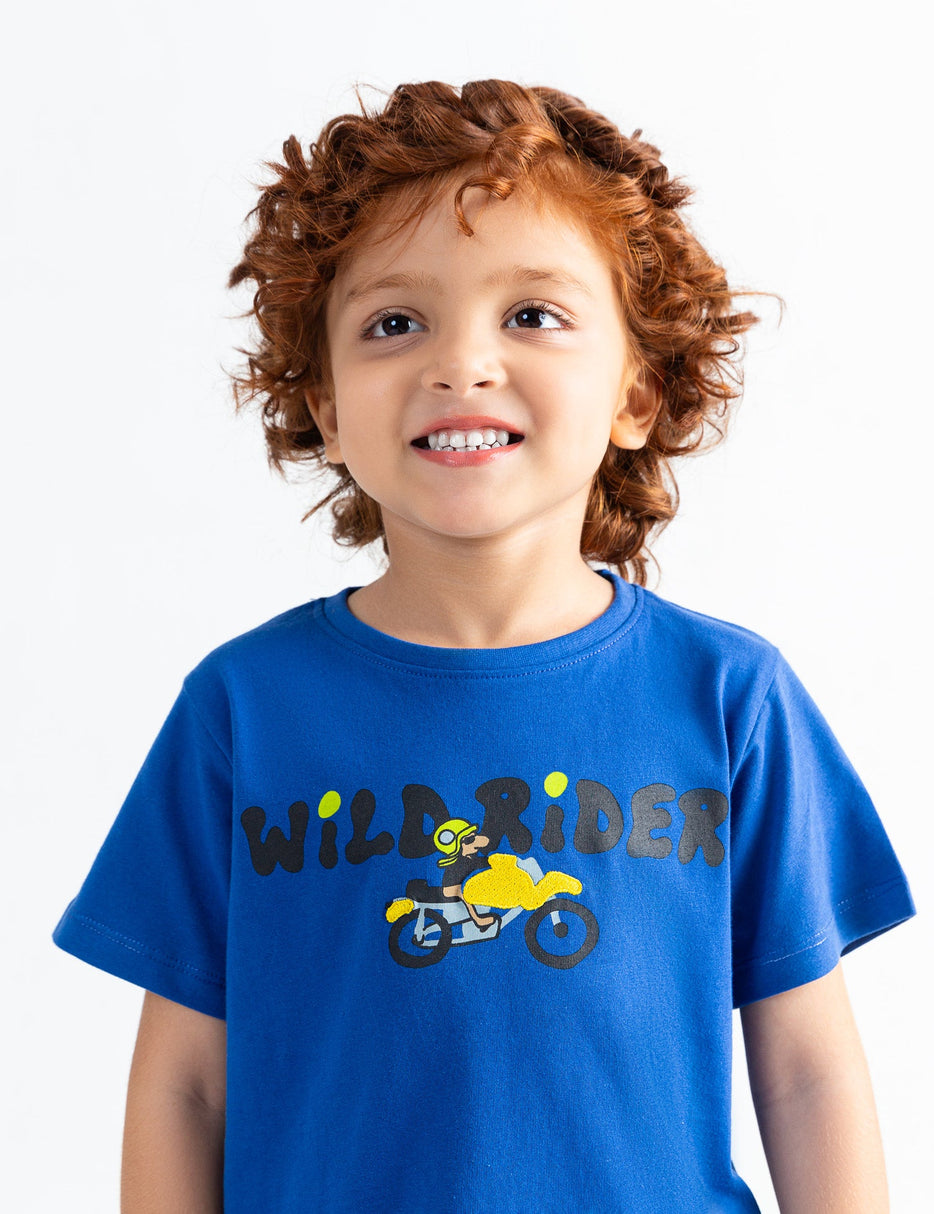 Add adventure to his wardrobe with this Wild Rider Printed T-Shirt for little boys. Featuring a bold and playful graphic print, this tee is made from soft, breathable cotton fabric to keep him comfy all day long. Perfect for casual wear, outdoor fun, or pairing with shorts and jeans for a cool everyday look.