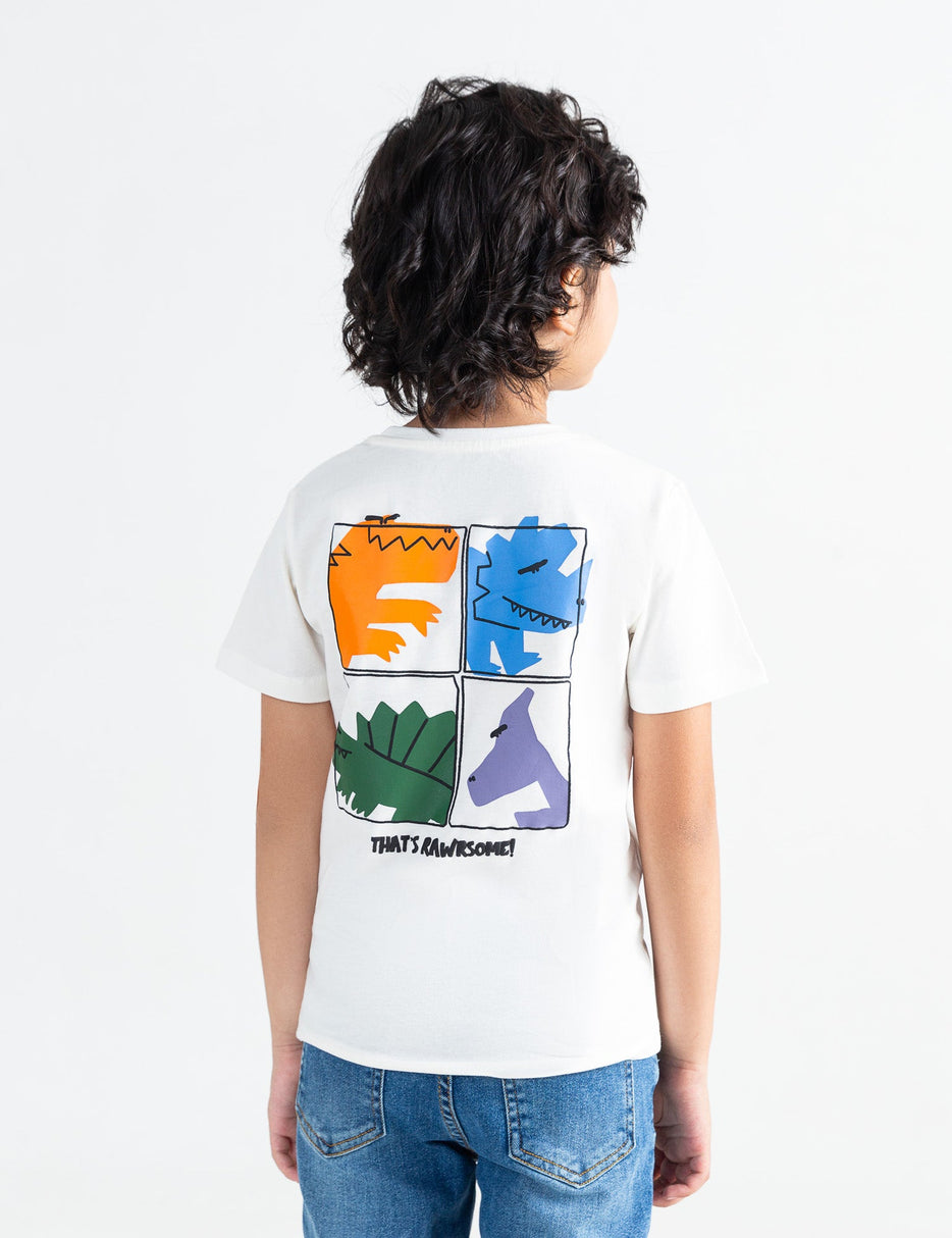 Bring some prehistoric fun to his wardrobe with this cool dino graphic t-shirt! Featuring a bold and playful dinosaur print, this tee is perfect for little dino fans. Made from soft, breathable fabric, it keeps him comfy all day—whether he's exploring, playing, or relaxing. With a classic crew neck and short sleeves, it’s easy to pair with shorts, jeans, or joggers for an effortlessly fun look. A roarsome choice for everyday wear!