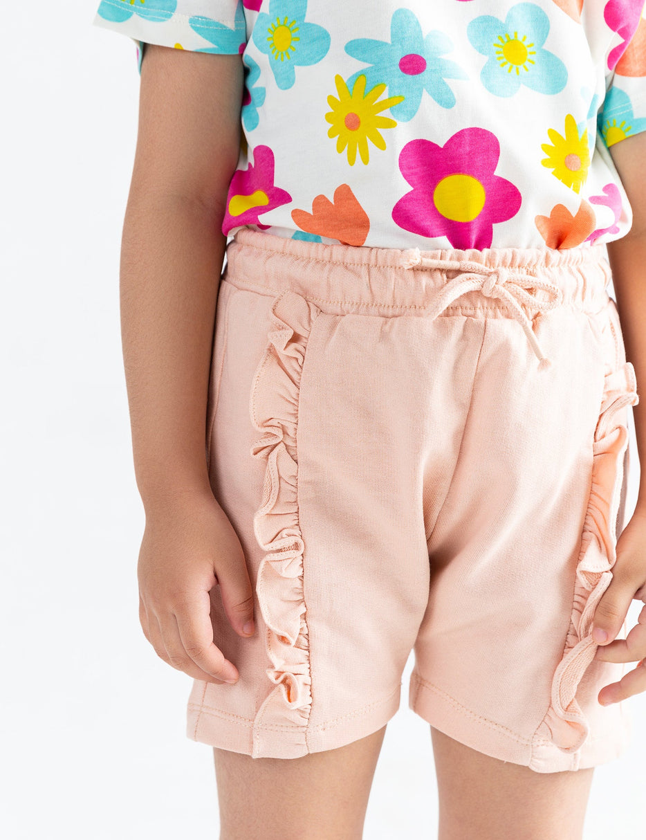 Add a touch of playful charm to your girl's everyday wardrobe with these shorts. Crafted from soft and breathable terry fabric, these neutral-toned shorts are both comfy and cute. The ruffled trim on both sides adds a stylish twist, while the elastic waistband with drawstring ensures a snug and adjustable fit.