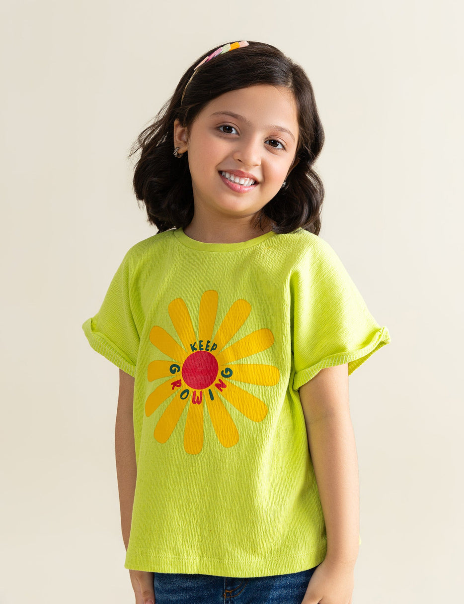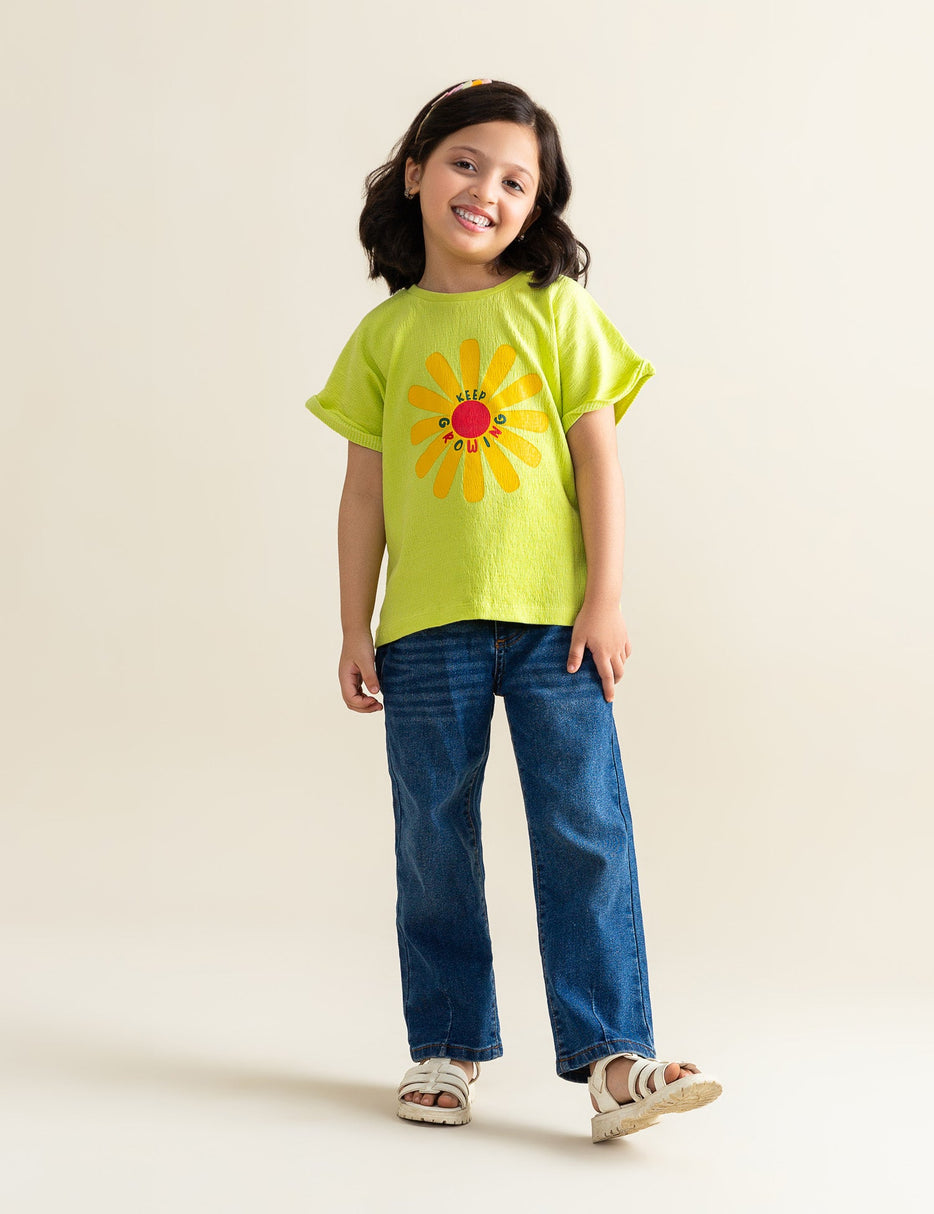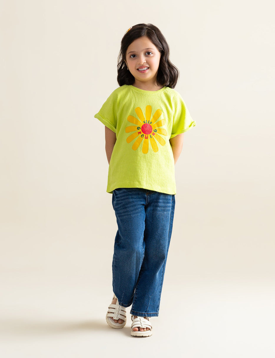 Inspire positivity and self-growth with the "Keep Growing" printed t-shirt for little girls. Crafted from soft and breathable cotton jersey, this tee features a charming, uplifting slogan in playful colors. The classic crew neck and short sleeves make it perfect for everyday comfort, whether at school, playdates, or casual outings. A feel-good piece designed to brighten her day and wardrobe!