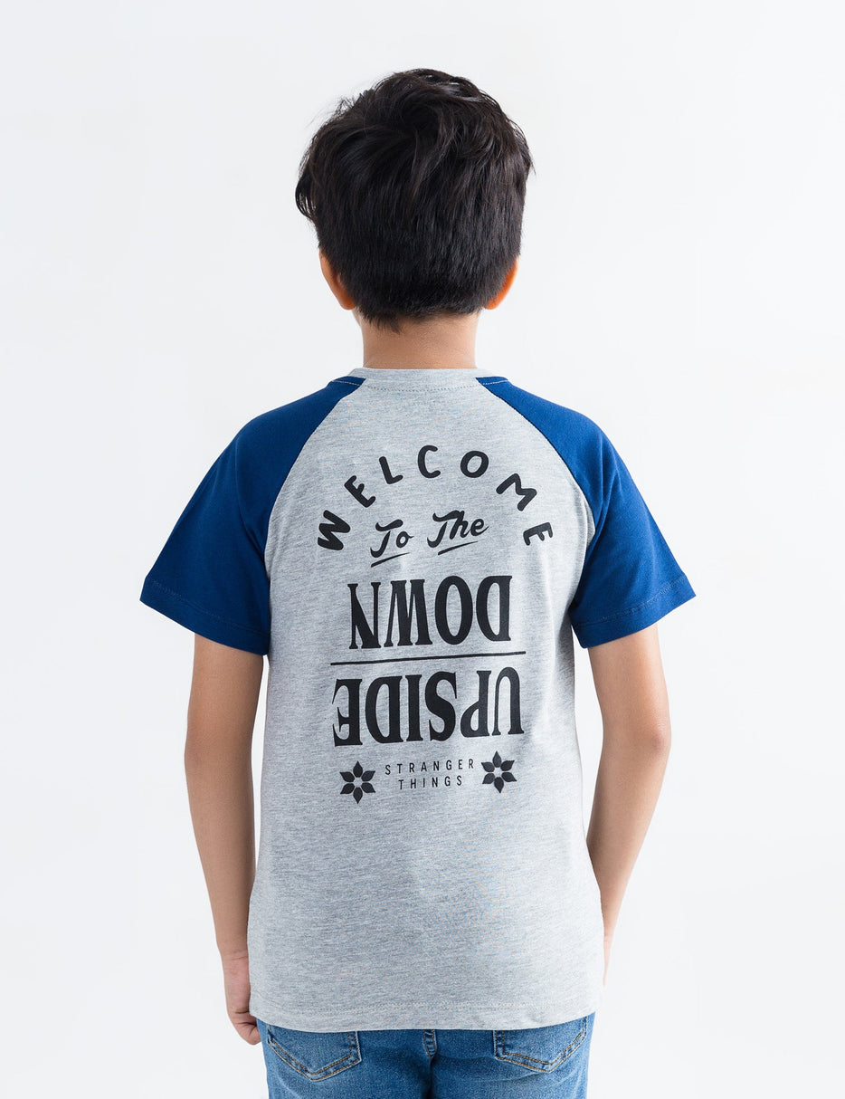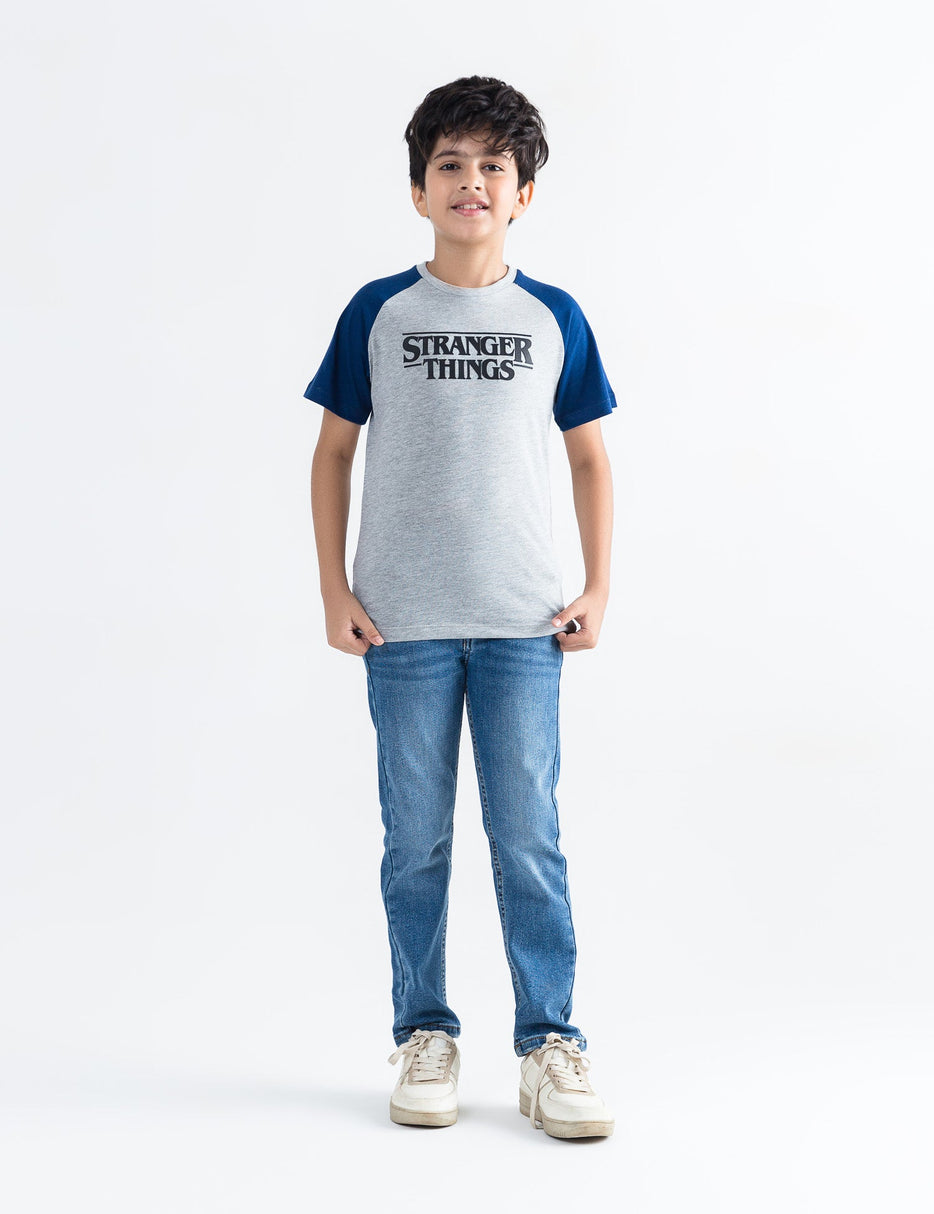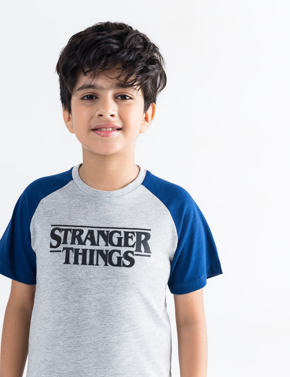 Bring the Upside Down to his wardrobe with this Stranger Things printed t-shirt for boys! Featuring bold graphics inspired by the hit series, this tee is a must-have for any young fan. Crafted from soft, breathable cotton, it ensures all-day comfort whether he's at school, hanging out with friends, or rewatching his favorite episodes. The classic crew neck and relaxed fit make it easy to style with jeans or shorts for a cool, casual look.