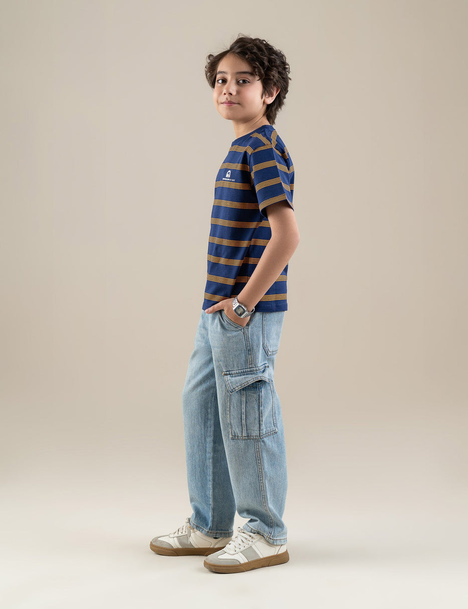 Smart, sporty, and perfect for everyday wear, this striped short sleeve T-shirt for boys is a wardrobe essential. Designed in a classic blue base with contrasting horizontal stripes, it offers a stylish yet casual look. Made from soft, breathable fabric, it ensures all-day comfort whether he’s at school, playing outdoors, or relaxing at home. The crew neckline and regular fit provide easy movement, while the durable stitching makes it ideal for active boys. Pair it with jeans, shorts, or joggers for a cool and effortless outfit.