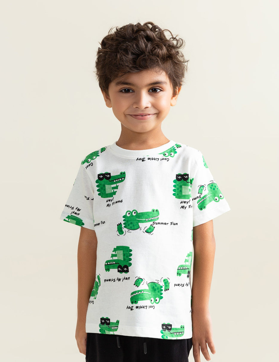 Add a splash of adventure to his everyday outfits with this Allover Crocodile Printed T-Shirt for little boys. Featuring a fun and lively crocodile print from front to back, this tee is made from soft, breathable cotton to keep him cool and comfortable all day long. The classic crew neckline and short sleeves make it easy to wear for playdates, outings, or relaxing at home.