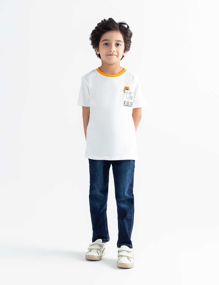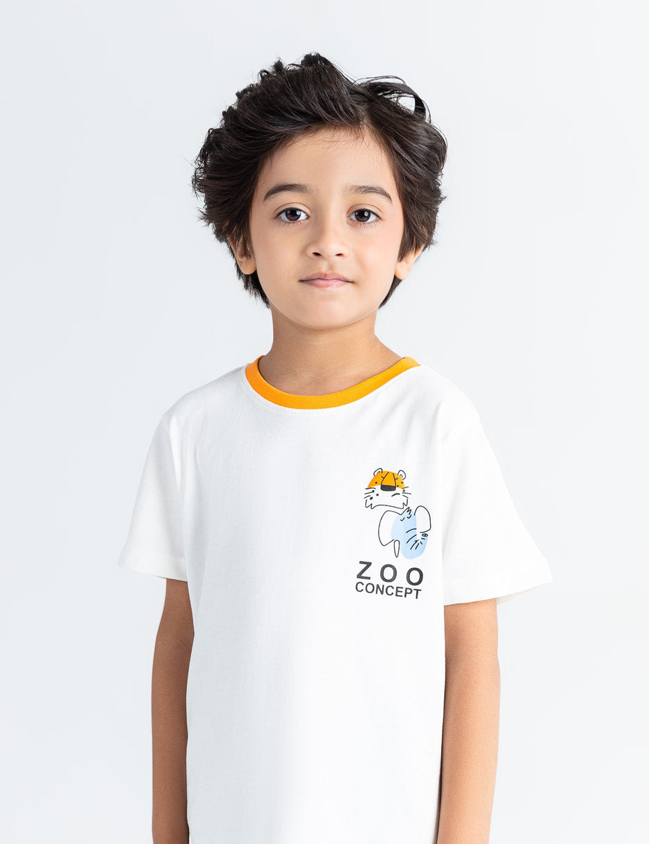 Bring a touch of fun to your little one’s everyday wardrobe with this playful Zoo Concept graphic t-shirt! Featuring a charming zoo animal illustration on a soft white base, and accented with a cheerful yellow neckline, this tee is both eye-catching and comfortable. Made from soft cotton for all-day wear—perfect for mini adventurers!