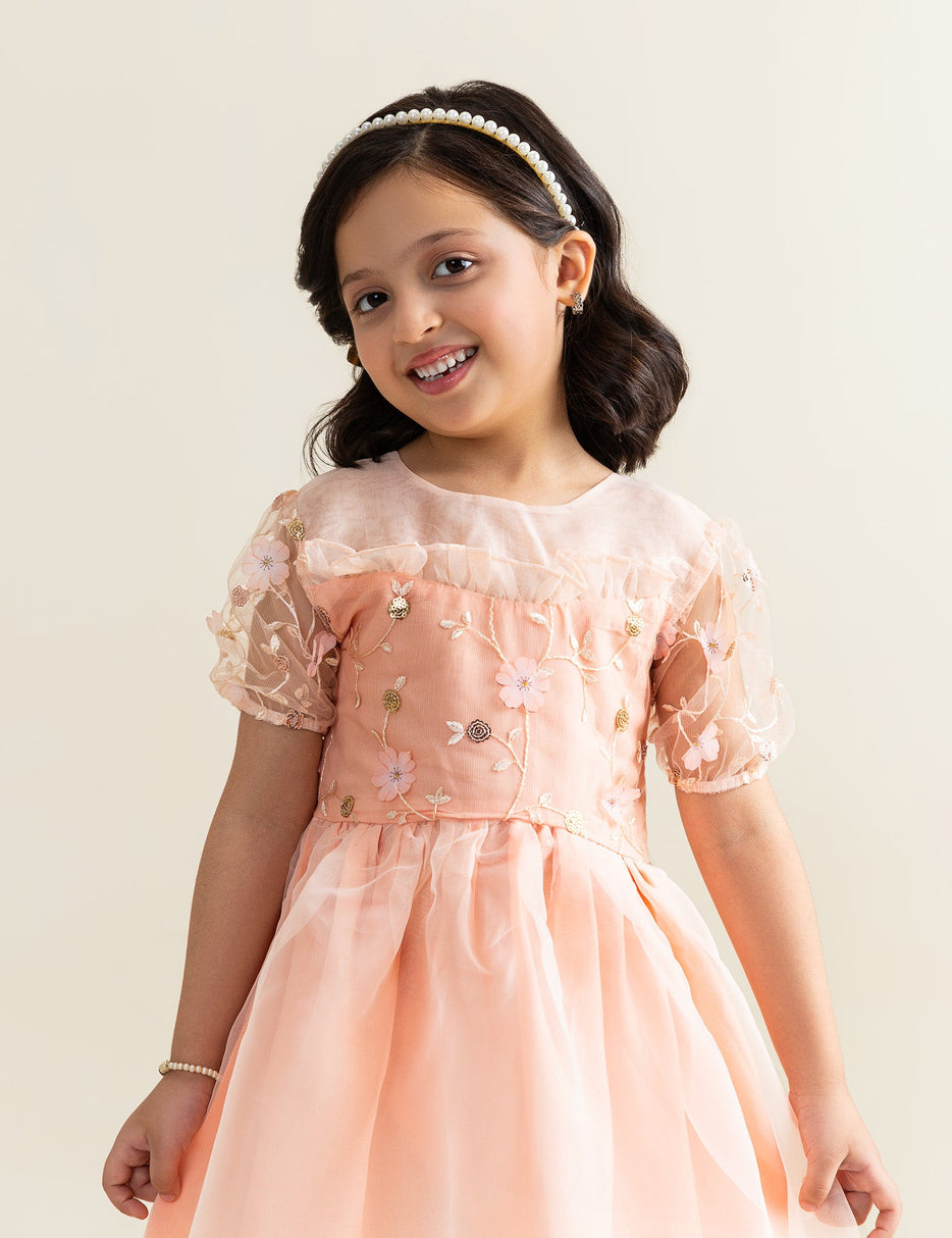 Make her special moments even more magical with this floral embroidered party dress for little girls. Designed in a soft blush pink shade, it features delicate floral embroidery on the bodice and sheer puff sleeves for a dreamy, elegant look. The flowy layered skirt adds graceful movement, making it perfect for birthdays, weddings, and festive celebrations.