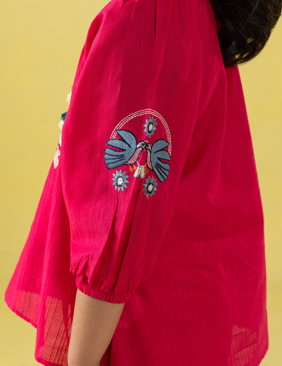 Add a touch of elegance to her wardrobe with this beautiful embroidered kurta and trouser set for girls. The set features a richly colored kurta adorned with delicate floral and bird embroidery on the front and sleeves, enhanced with stylish tassel detailing at the neckline. Paired with matching straight-fit trousers, this outfit is crafted from soft, breathable fabric to ensure all-day comfort. Perfect for festive occasions, family gatherings, or special outings, this charming ethnic set blends traditional design with modern comfort for a graceful look.