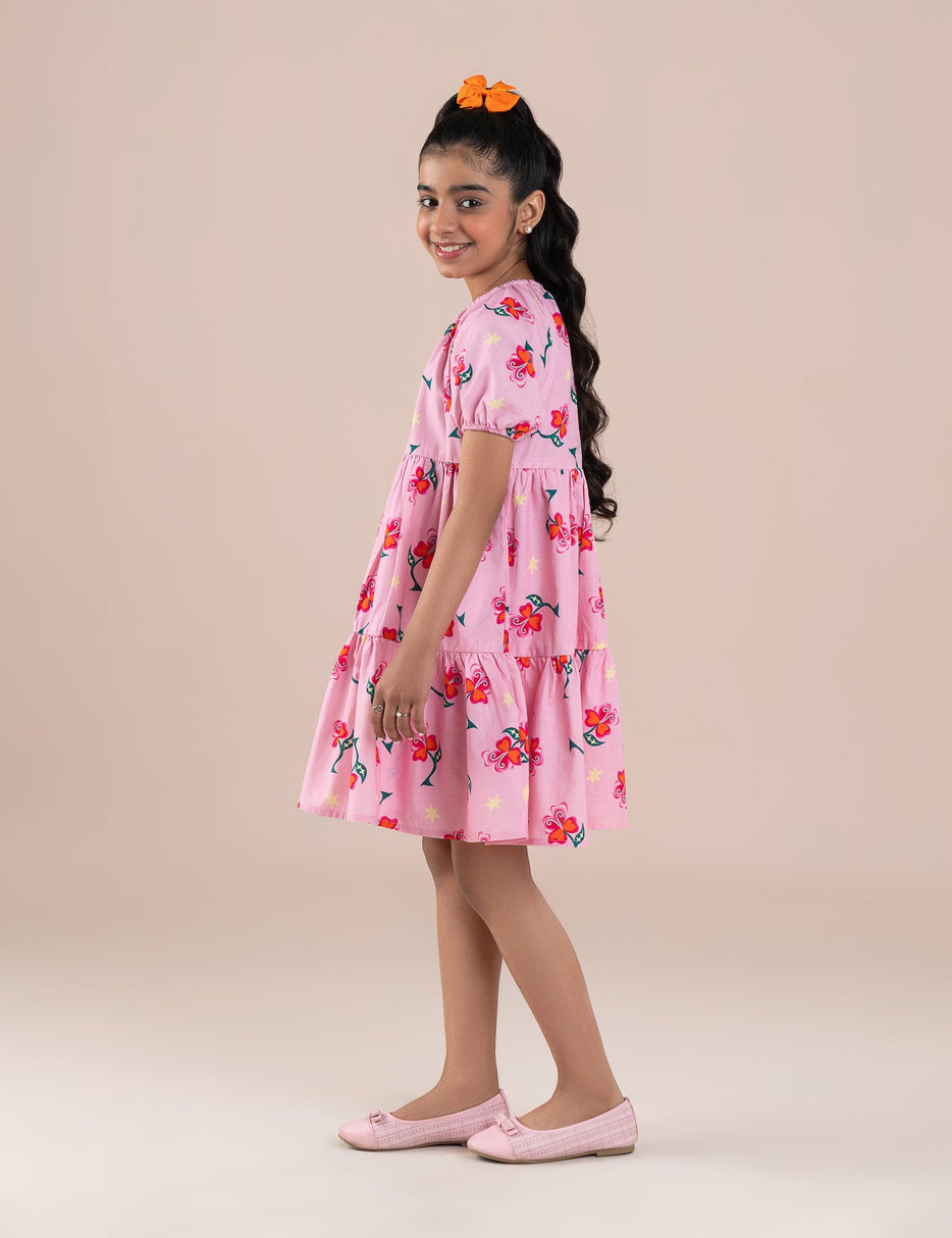 Brighten up her wardrobe with this charming floral printed dress for girls. Designed with a soft, breathable fabric, it offers all-day comfort while showcasing a beautiful all-over floral print for a fresh and playful look. The relaxed fit allows easy movement, making it perfect for casual wear, outings, or special occasions. Easy to style and delightful to wear, this dress is a lovely choice for every little fashionista.