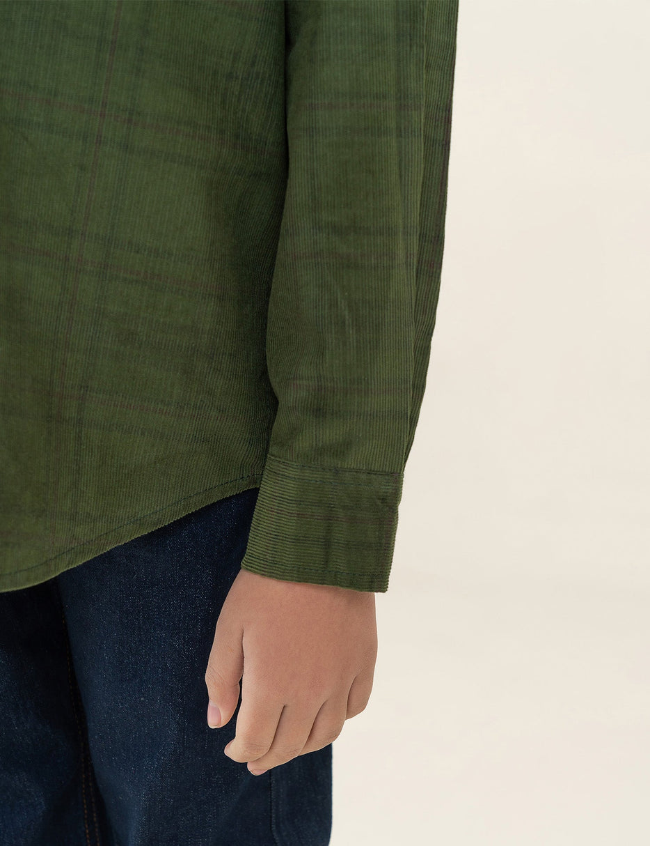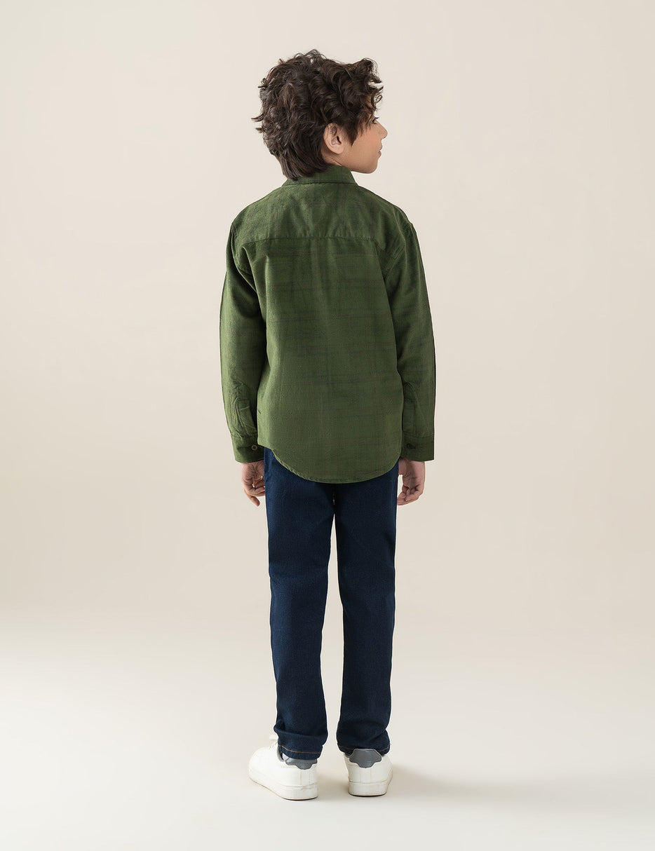 This olive green button-down shirt for boys features a clean and classic design with subtle check detailing. Made from soft, breathable fabric, it includes long sleeves, a structured collar, and two front flap pockets for added style. Perfect for casual outings or semi-formal occasions, this versatile shirt pairs well with jeans, chinos, or shorts for a smart, stylish look.