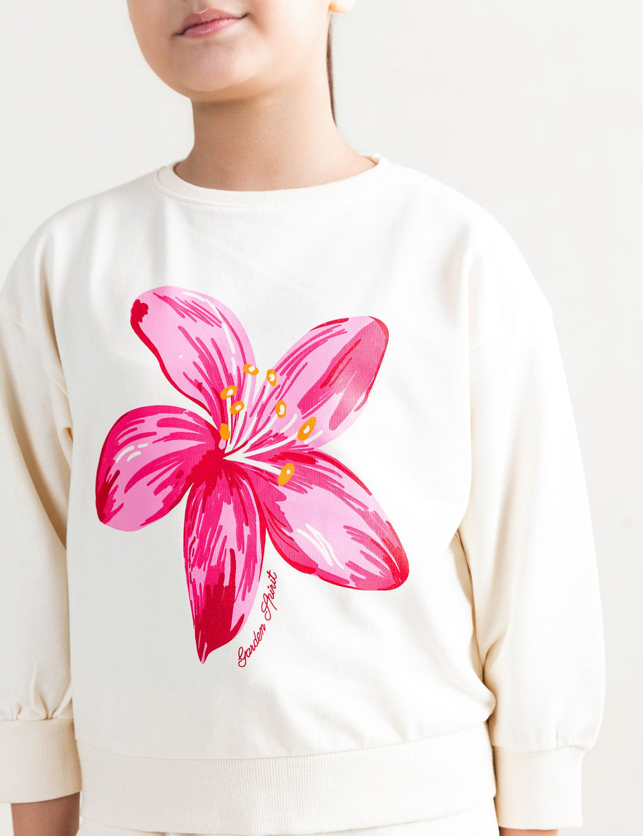 This girls’ cream two-piece set combines cozy comfort with a touch of style. The soft sweatshirt features a bold pink floral print on the front, adding a pop of color to the look. Paired with matching jogger pants featuring an elastic waistband and cuffs for a snug fit, this outfit is perfect for casual days, lounging, or playtime. Made from soft, breathable fabric, it ensures all-day comfort while keeping your little one stylish and relaxed.