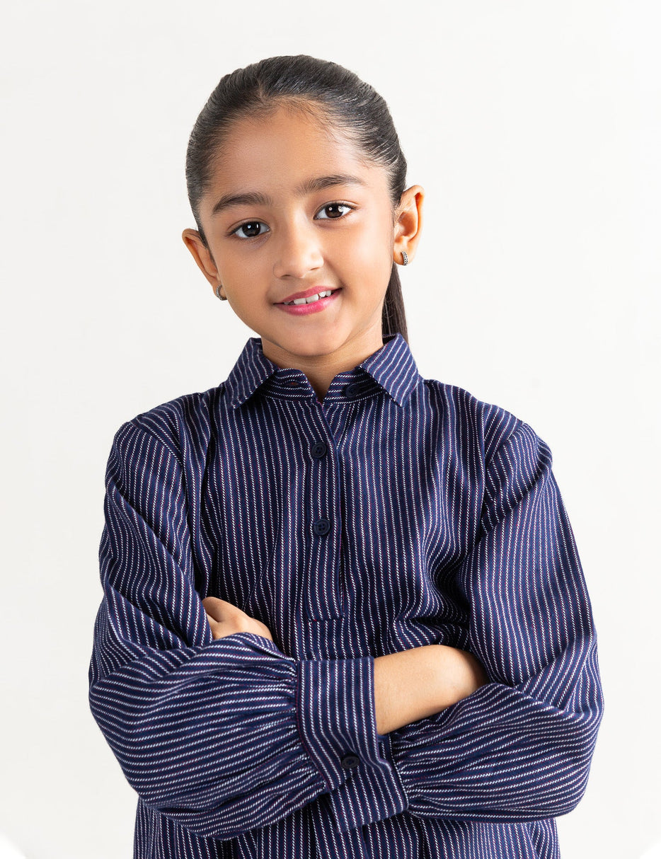 This elegant navy blue striped long shirt dress for girls combines comfort and style effortlessly. Designed with a collared neckline, front buttons, and long puff sleeves with cuffs, it offers a chic and polished look. The soft, breathable fabric ensures ease of movement, making it perfect for school, family gatherings, or casual outings. The vertical stripe pattern adds a touch of sophistication, making this dress a timeless wardrobe favorite.