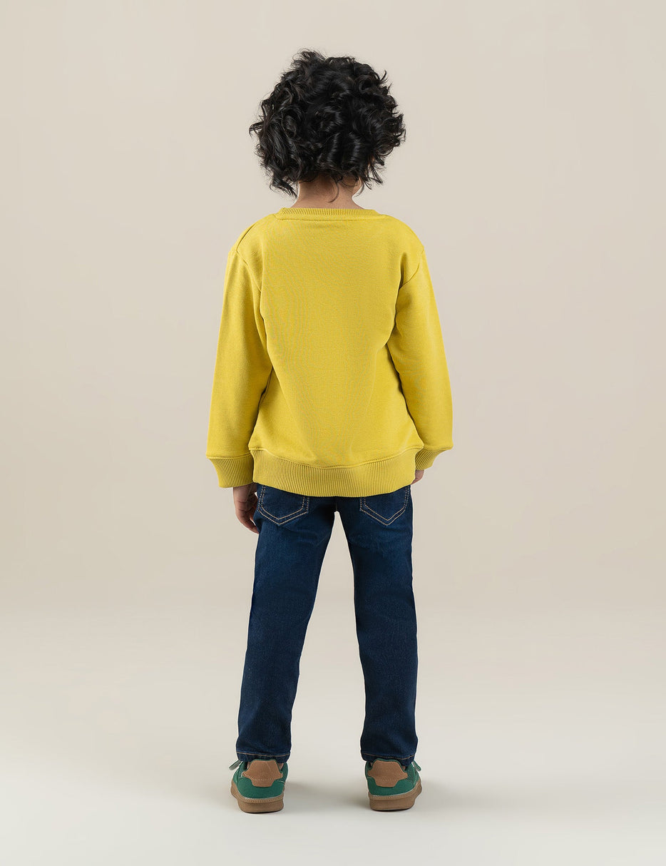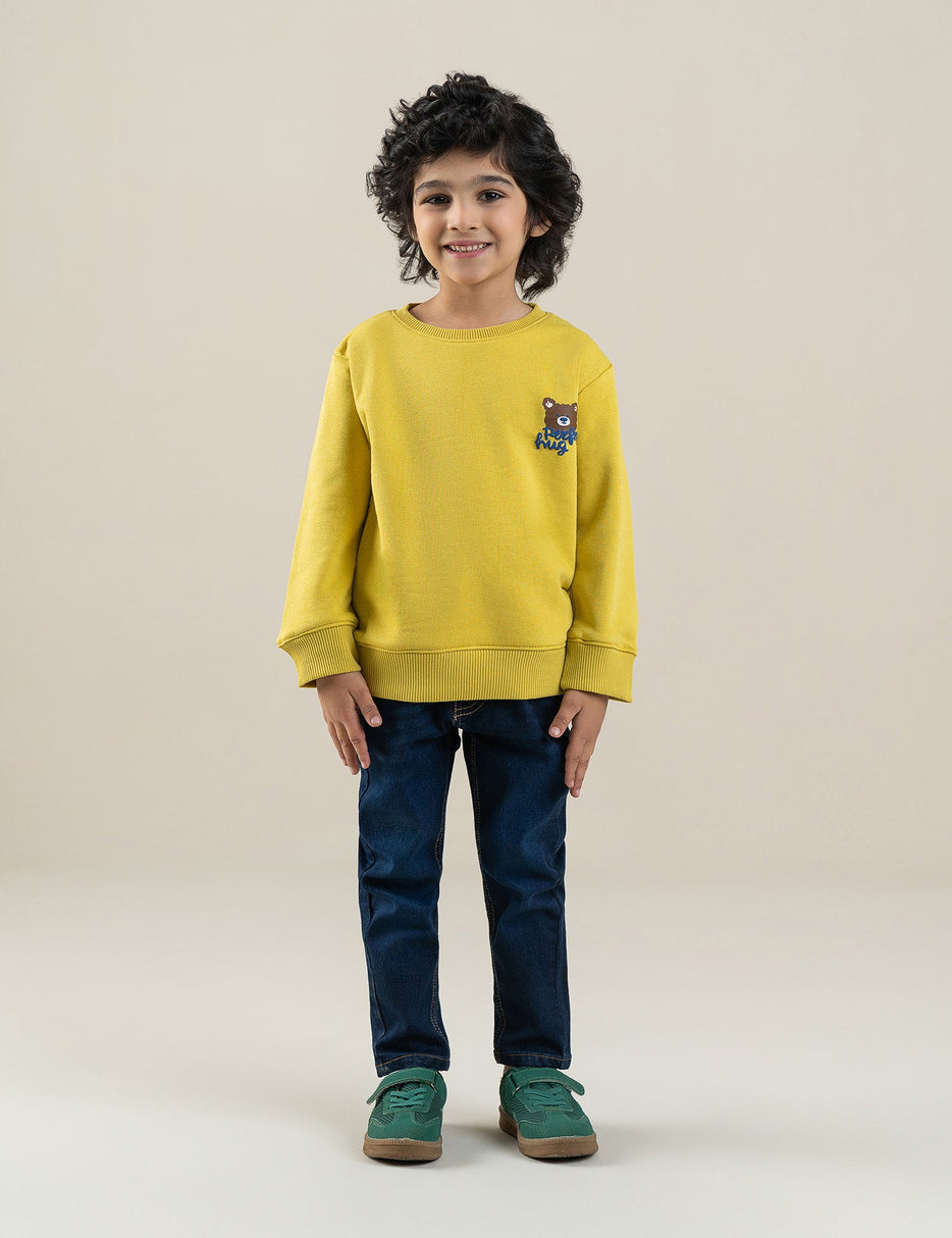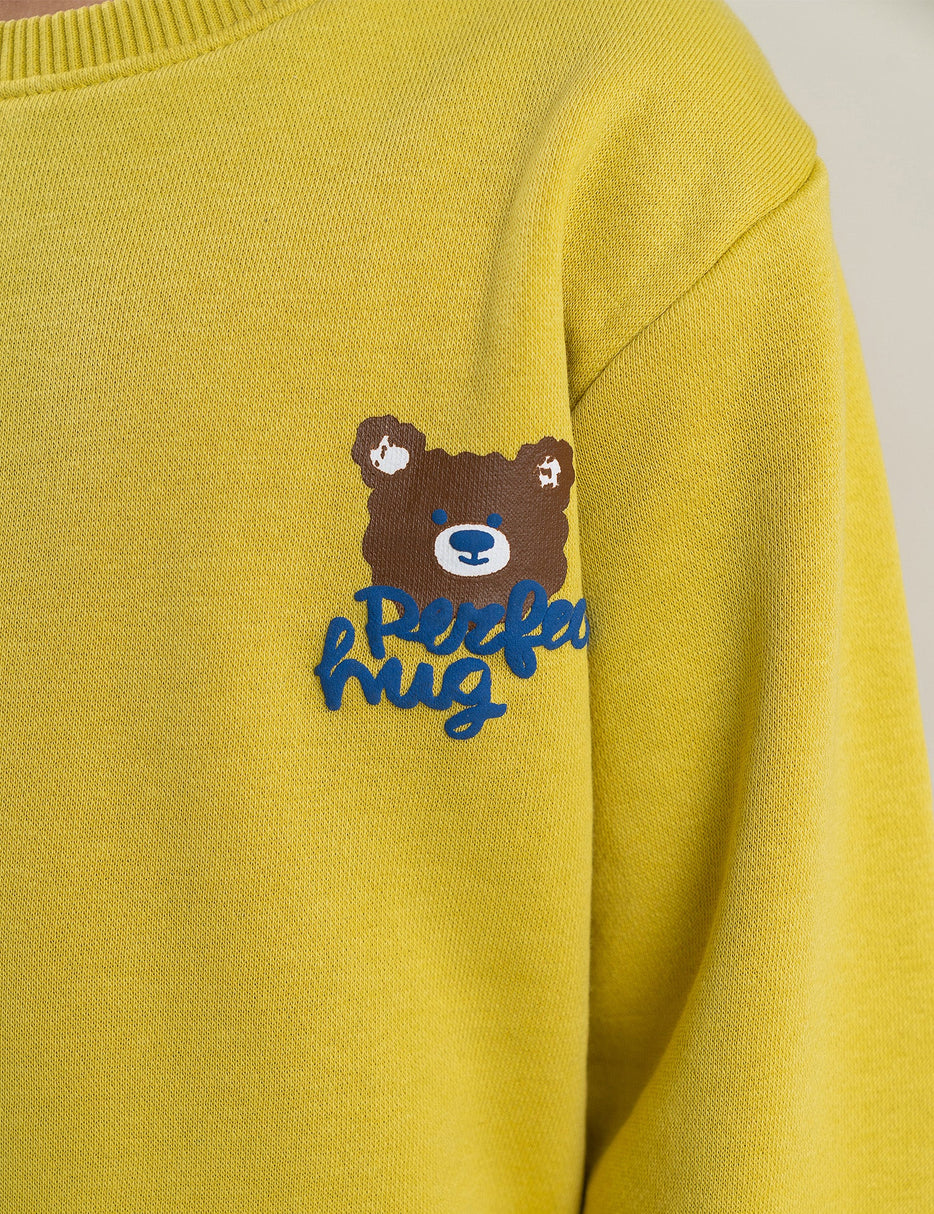 Keep your little one cozy and cute in this bright yellow sweatshirt featuring an adorable embroidered bear with the words “Perfect Hug.” Made from soft, comfortable fabric with ribbed cuffs and hem for a snug fit, it’s perfect for everyday wear or outdoor play. The cheerful color adds a fun pop to any outfit, making it a must-have for your boy’s wardrobe.
