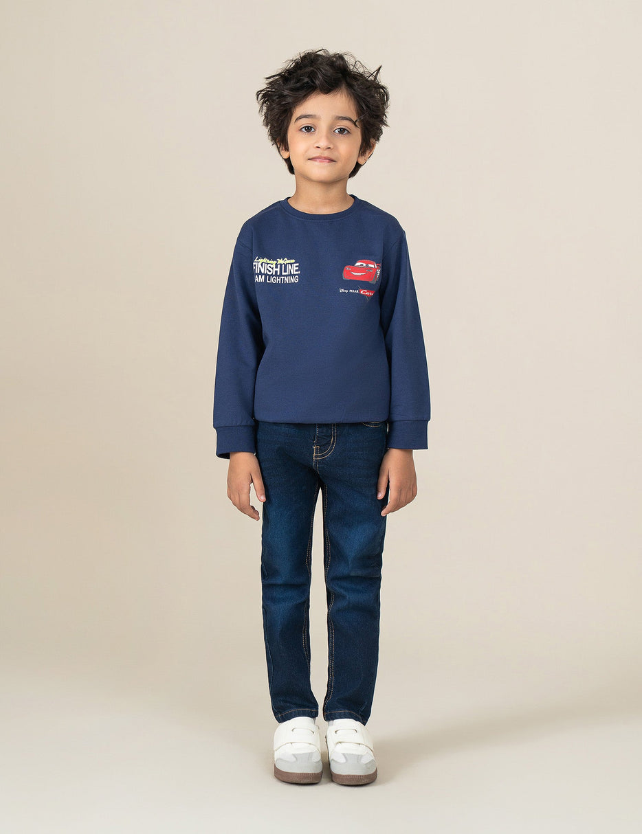 Rev up your little boy’s wardrobe with this cool navy blue sweatshirt featuring Disney Pixar's Lightning McQueen from Cars. Made from soft, comfortable fabric, this sweatshirt showcases a fun "Finish Line – I Am Lightning" graphic and a bold McQueen print. Perfect for everyday wear or cozy outings, it adds a playful touch while keeping your child warm and stylish. A must-have for young Cars fans!