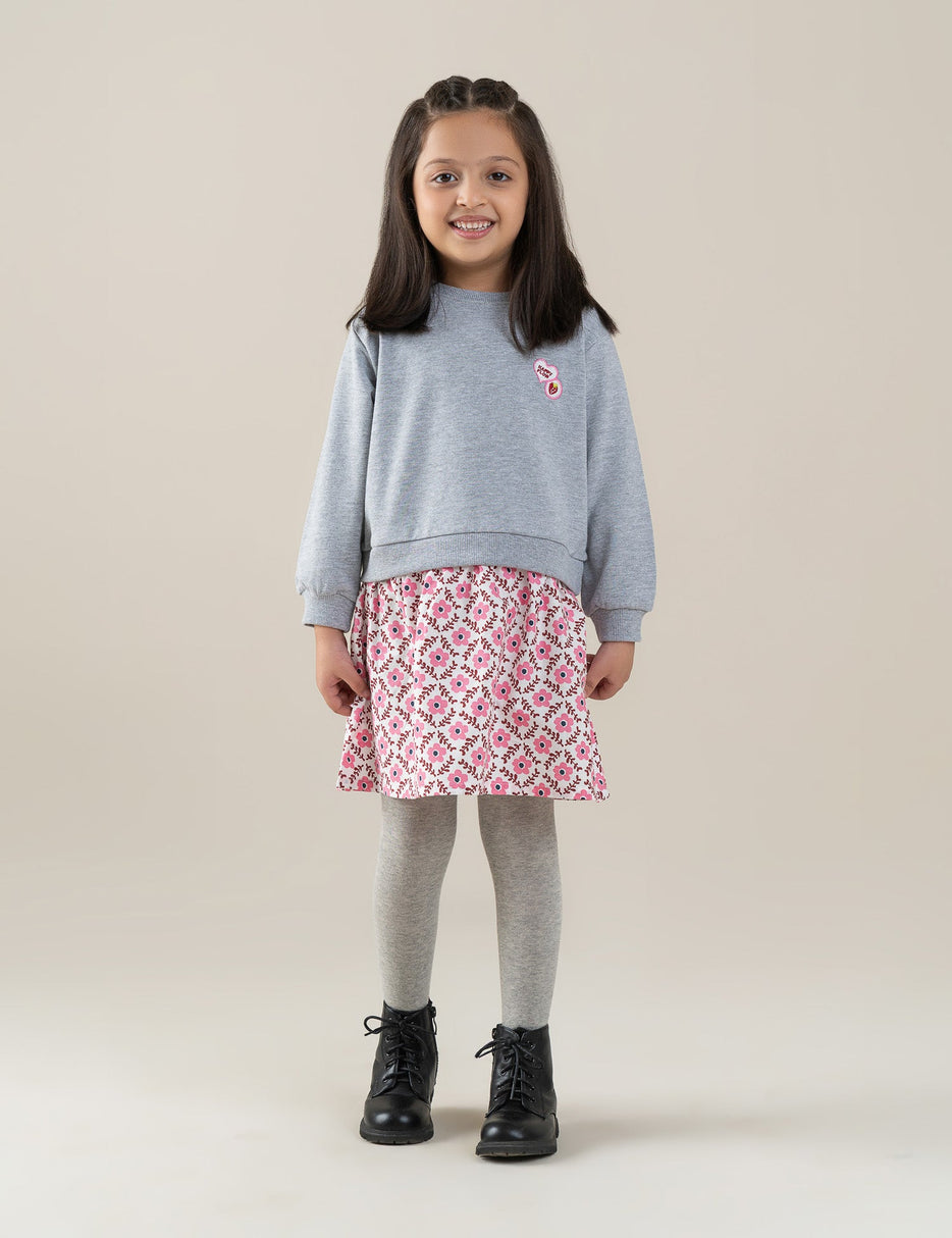 Cute, comfy, and perfect for everyday wear — this sweatshirt dress combines a soft grey top with a pretty floral skirt for an effortlessly adorable look. The cozy sweatshirt bodice features sweet embroidered patches, while the printed skirt adds a pop of color with its pink floral pattern. Designed with ribbed cuffs and a relaxed fit, it’s an ideal pick for playdates, outings, and all-day comfort. A lovely wardrobe essential for your little girl!