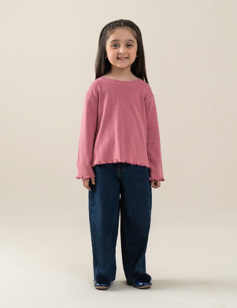 This cute pink long-sleeve ribbed t-shirt for little girls features soft, stretchy fabric for all-day comfort. The delicate lettuce-edge frills on the sleeves and hem add a sweet, girly touch. Perfect for everyday wear, this t-shirt pairs beautifully with jeans, skirts, or leggings, making it a versatile and stylish addition to any little girl’s wardrobe.
