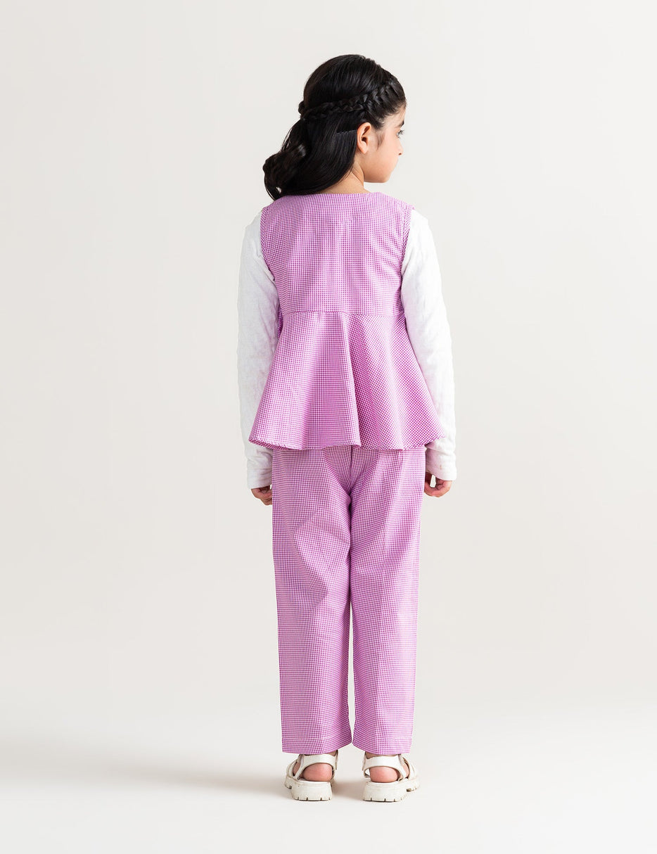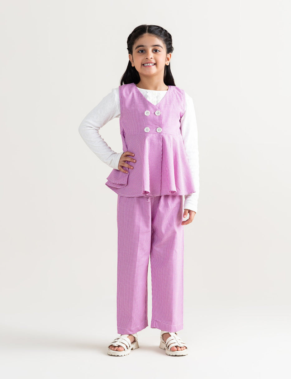 This adorable girls’ outfit set includes a pink checkered peplum-style top with white button details and matching straight-cut pants. The sleeveless top features a flared hem for a cute and comfortable fit, perfect for both casual outings and special occasions. Made from soft, breathable fabric, this set ensures all-day comfort and style. Pair it with sandals or sneakers for a charming, playful look.