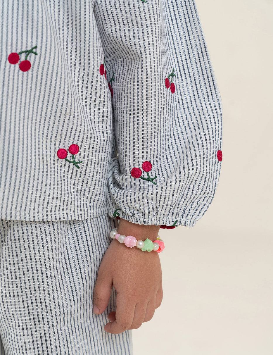 Sweet and stylish, this Cherry Print Striped 2-Piece Set is perfect for your little girl’s everyday wear. The outfit includes a long-sleeve button-down top with an adorable red cherry print on fine vertical stripes, paired with matching elastic-waist pants for easy comfort and movement. Made from soft, breathable cotton fabric, it’s gentle on the skin and ideal for playtime, outings, or lounging at home. The gathered sleeves and frill neckline add a charming touch, making this set both cute and comfortable—just right for any occasion!