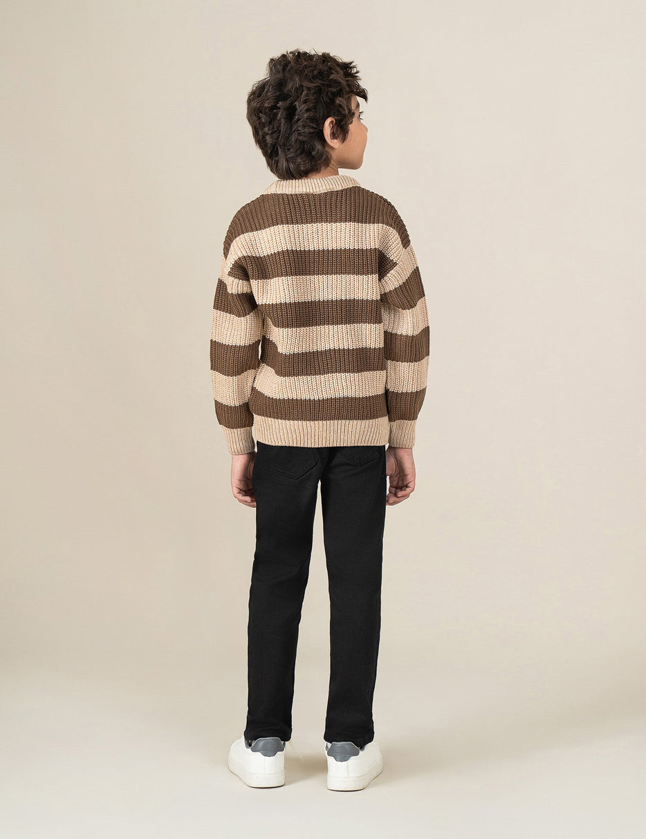 Keep your little one cozy and stylish with this Striped Knitted Sweater for Boys. Featuring bold horizontal stripes in earthy tones, this sweater adds a touch of classic charm to any outfit. Made from soft, warm knit fabric, it provides ultimate comfort during chilly days. Perfect for layering over shirts or pairing with jeans for a casual, trendy look.