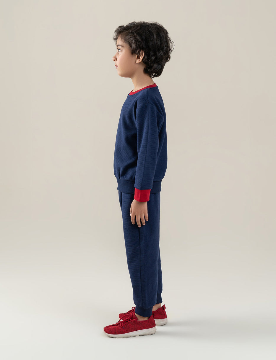 A comfy and classic 2-piece suit for little boys, featuring a soft navy sweatshirt with bold red contrast cuffs and neckline for a sporty touch. Paired with matching navy jogger pants designed with an elastic waistband for an easy, flexible fit. Perfect for everyday wear, playtime, or lounging—this cozy set keeps him comfortable and looking effortlessly cool.
