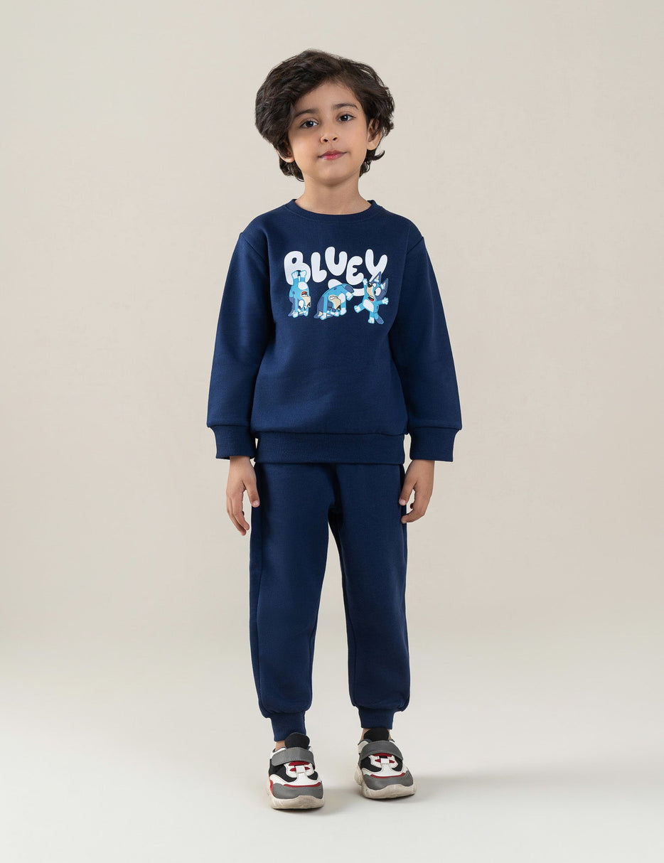 Let your little one enjoy playful style with this 2-piece Bluey graphic suit for boys. Featuring a comfy sweatshirt with a fun Bluey character graphic and matching jogger pants, this set is perfect for everyday wear. Made from soft, breathable fabric with an easy fit, it keeps him cozy through playtime, outings, and relaxed days at home. A must-have outfit for every Bluey fan!