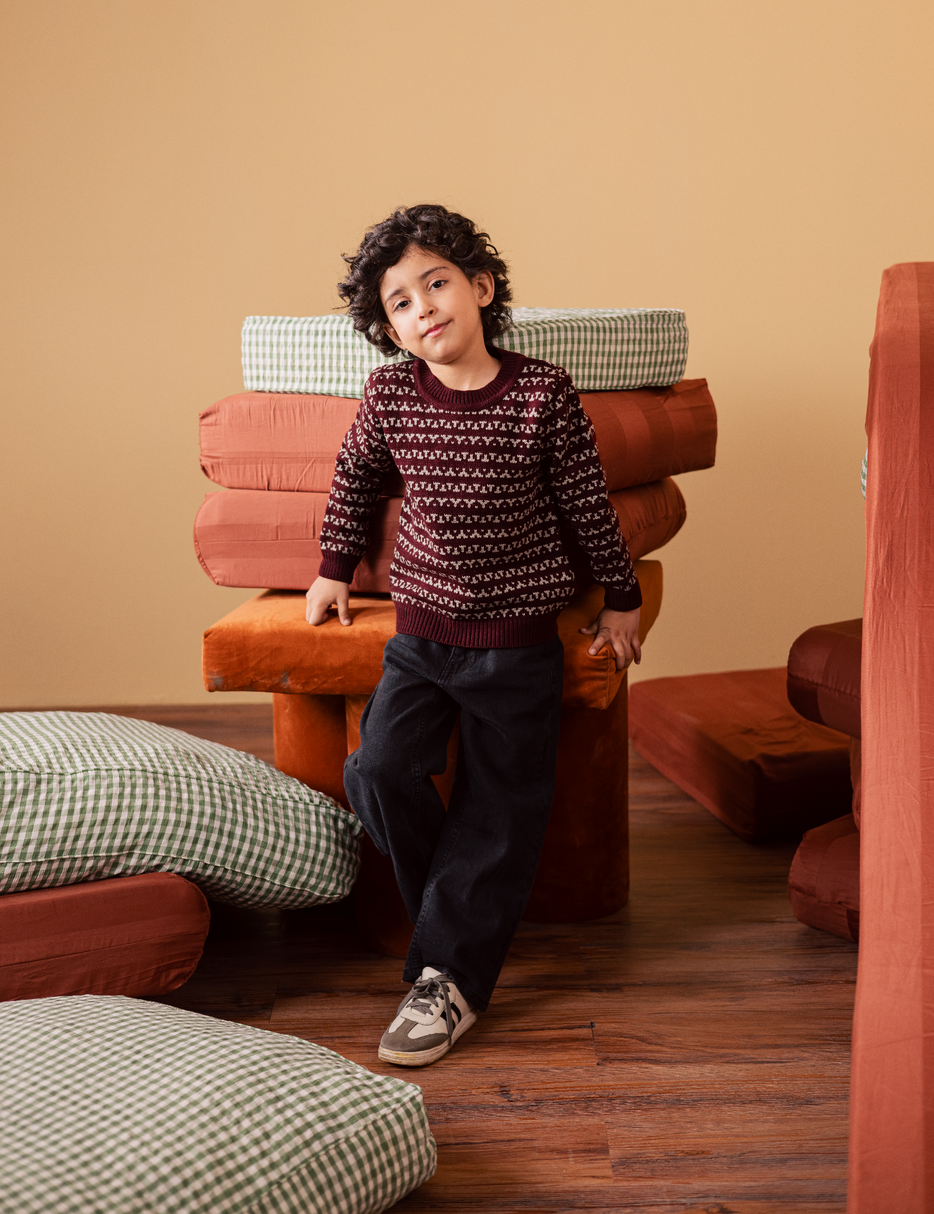 This warm, hand-knit sweater features a charming brown and cream color pattern with a classic crew neck and ribbed cuffs and hem. The soft wool texture makes it perfect for keeping warm on chilly days while adding a touch of timeless style. Ideal for casual wear or as a cozy winter layer.